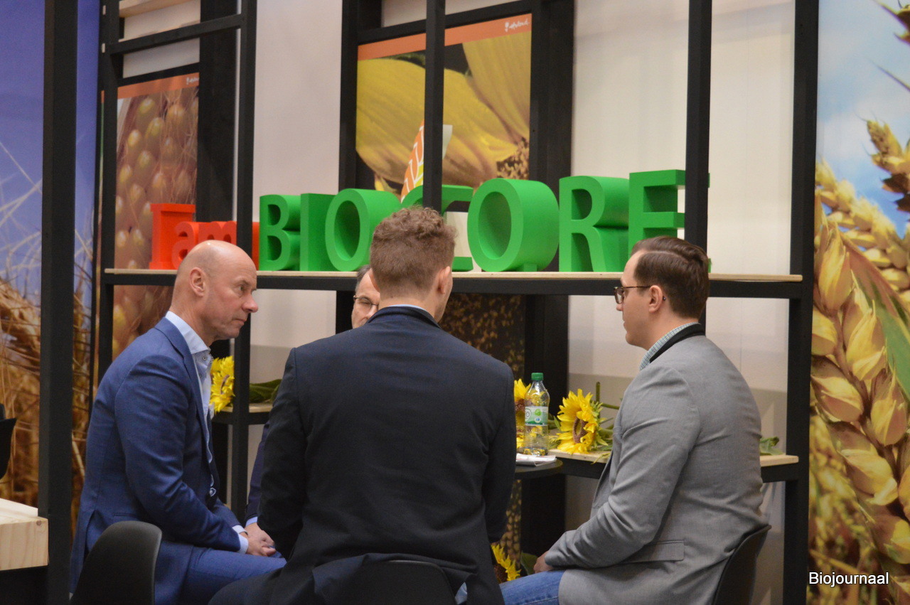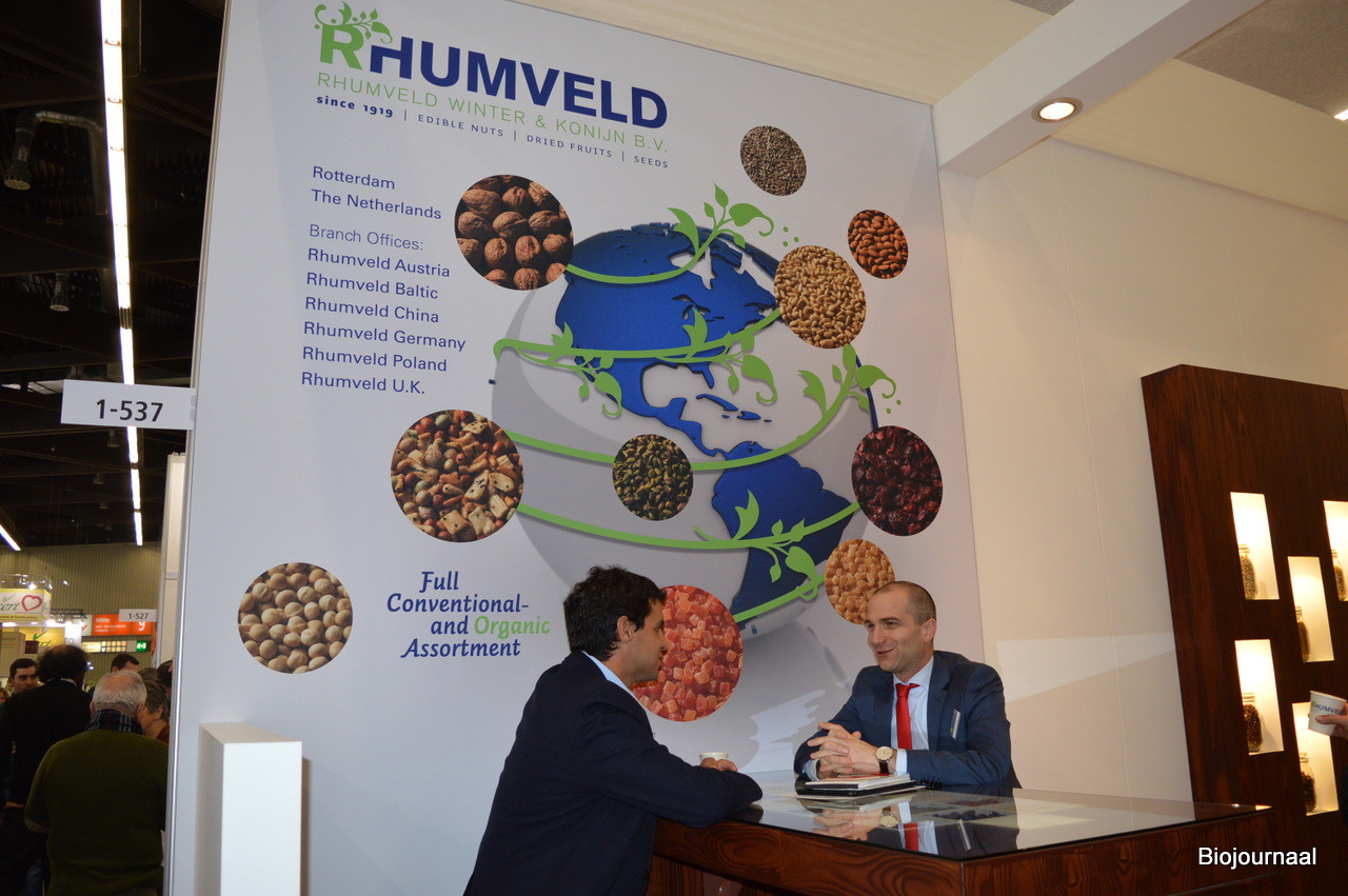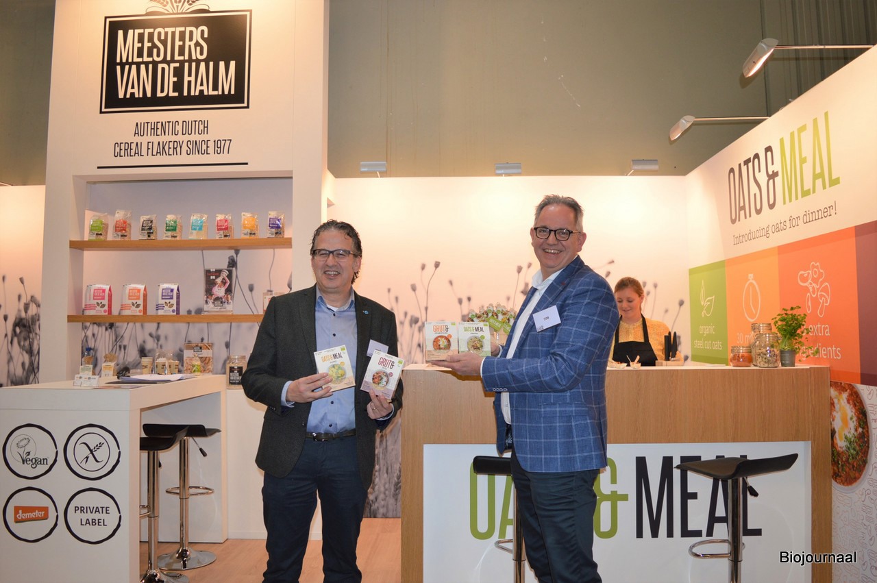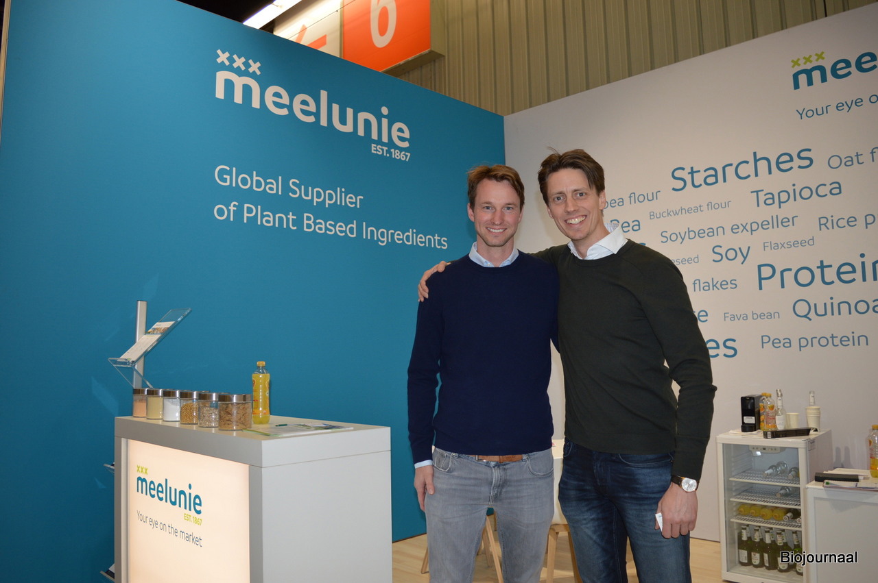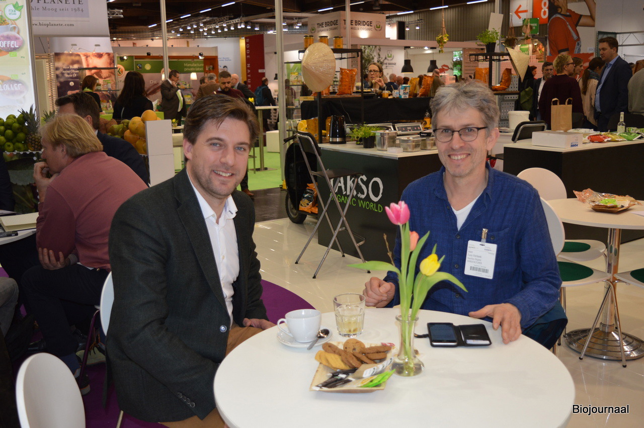 Jaap Stockmann en Gijs van Elst debuteerden met Meelunie op de beurs in Neurenberg. Gijs: "We groeien met onze grote klanten mee in biologisch en zijn tot nu toe positief verrast over het niveau van deze beurs."