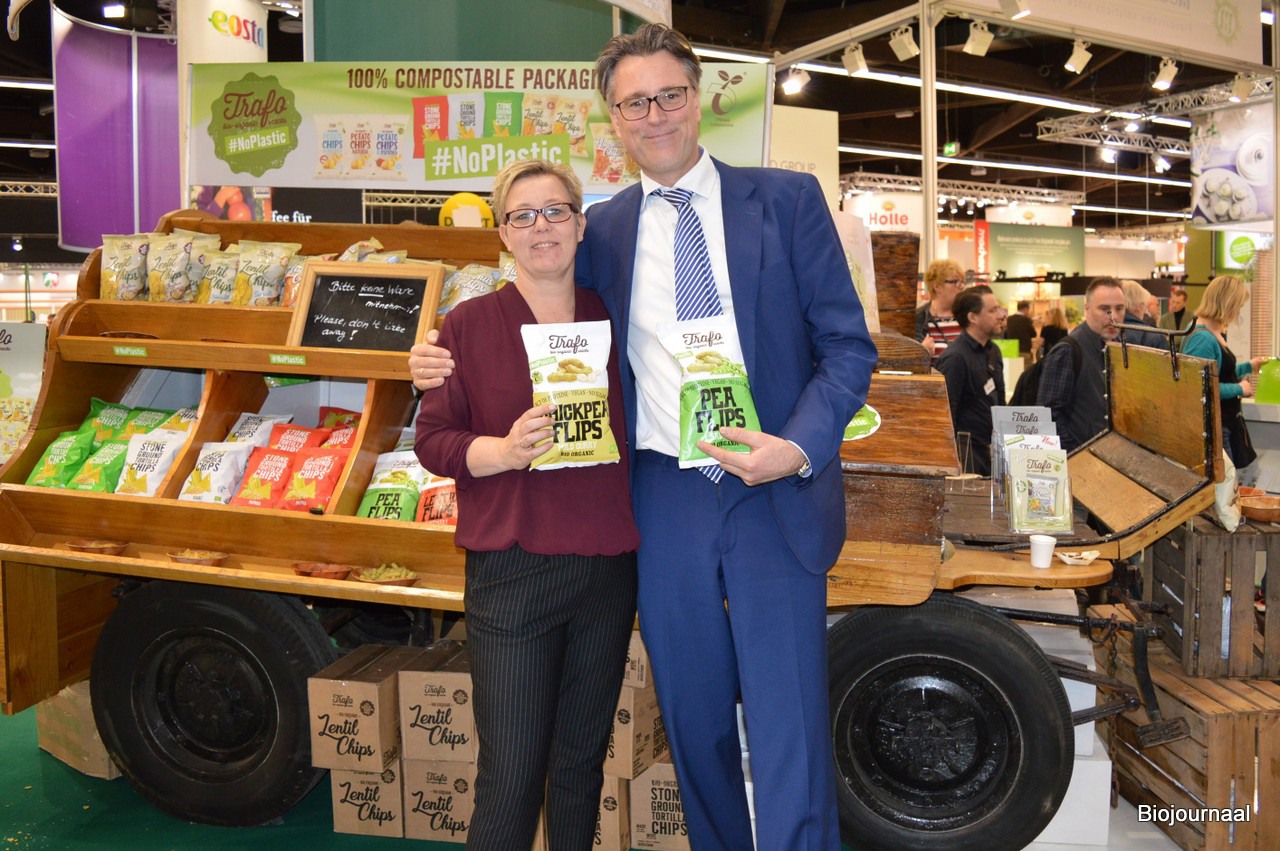 Janet Nuyten-Sijtsema en Bjorn Andringa laten bij FZ Organic Food de nieuwste Trafo-chips zien, gemaakt van peulvruchten. Bovenop de kar vraagt het bedrijf aandacht voor het feit dat ze voor #NoPlastic gaan, door te investeren in 100% composteerbare verpakkingen. Janet was op Valentijnsdag overigens exact 12 jaar in dienst bij het bedrijf.