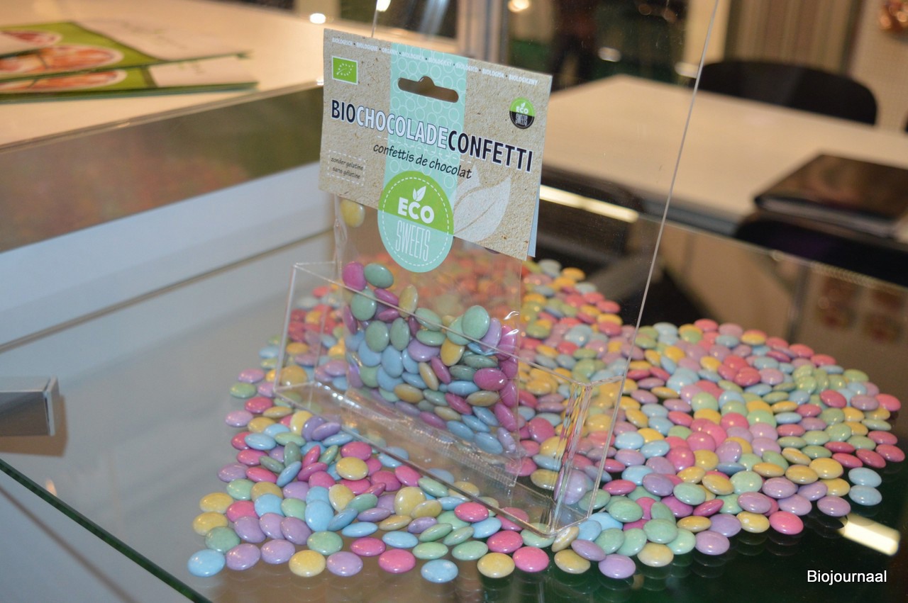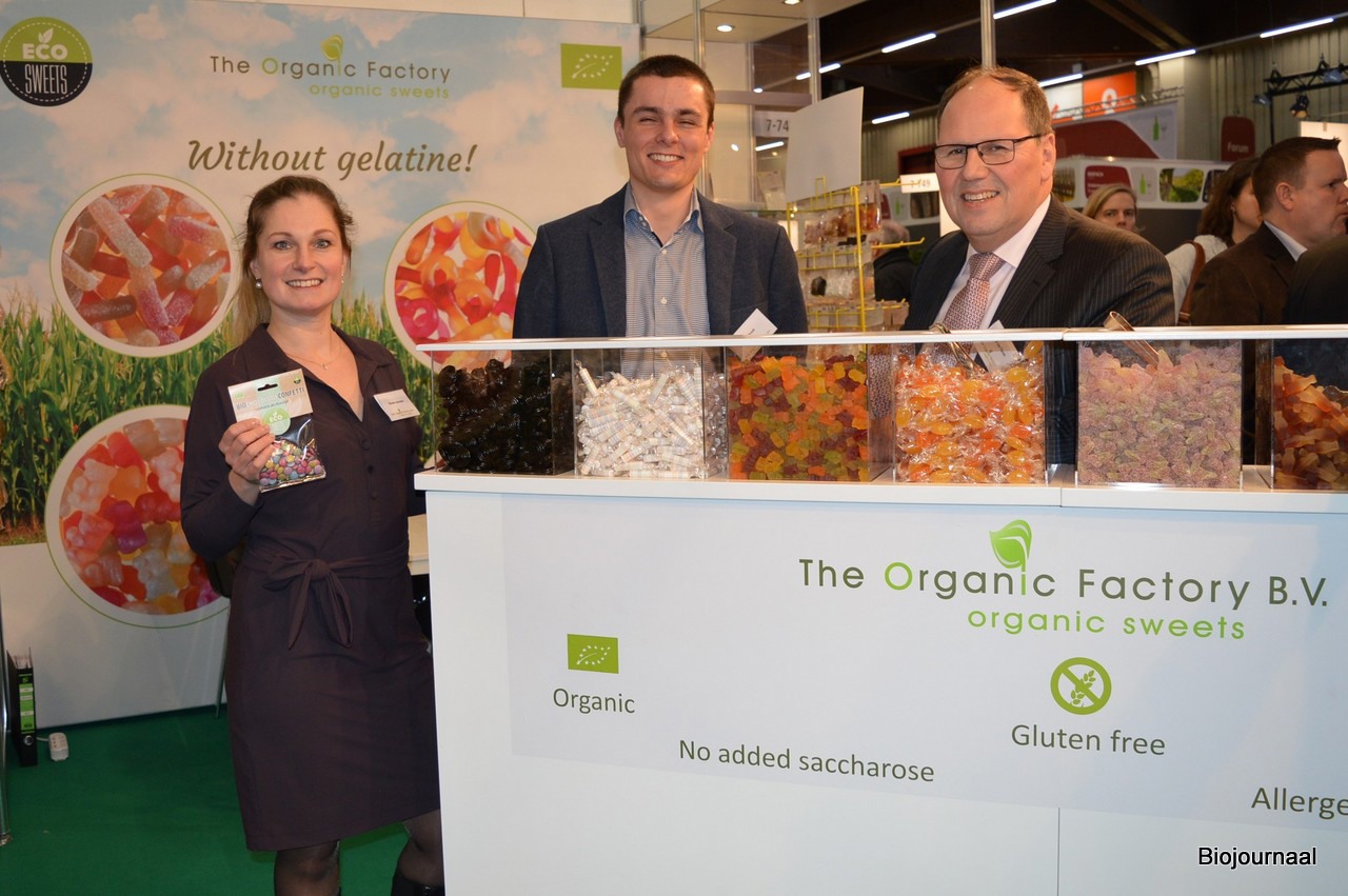 Meeke Janssens, Aart Broek en Fred van Tienen zijn bij The Organic Factory zichtbaar trots op de nieuwste EcoSweets: Bio Chocolade Confetti.