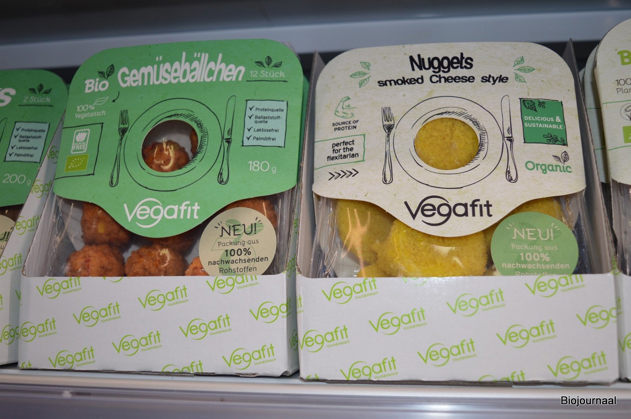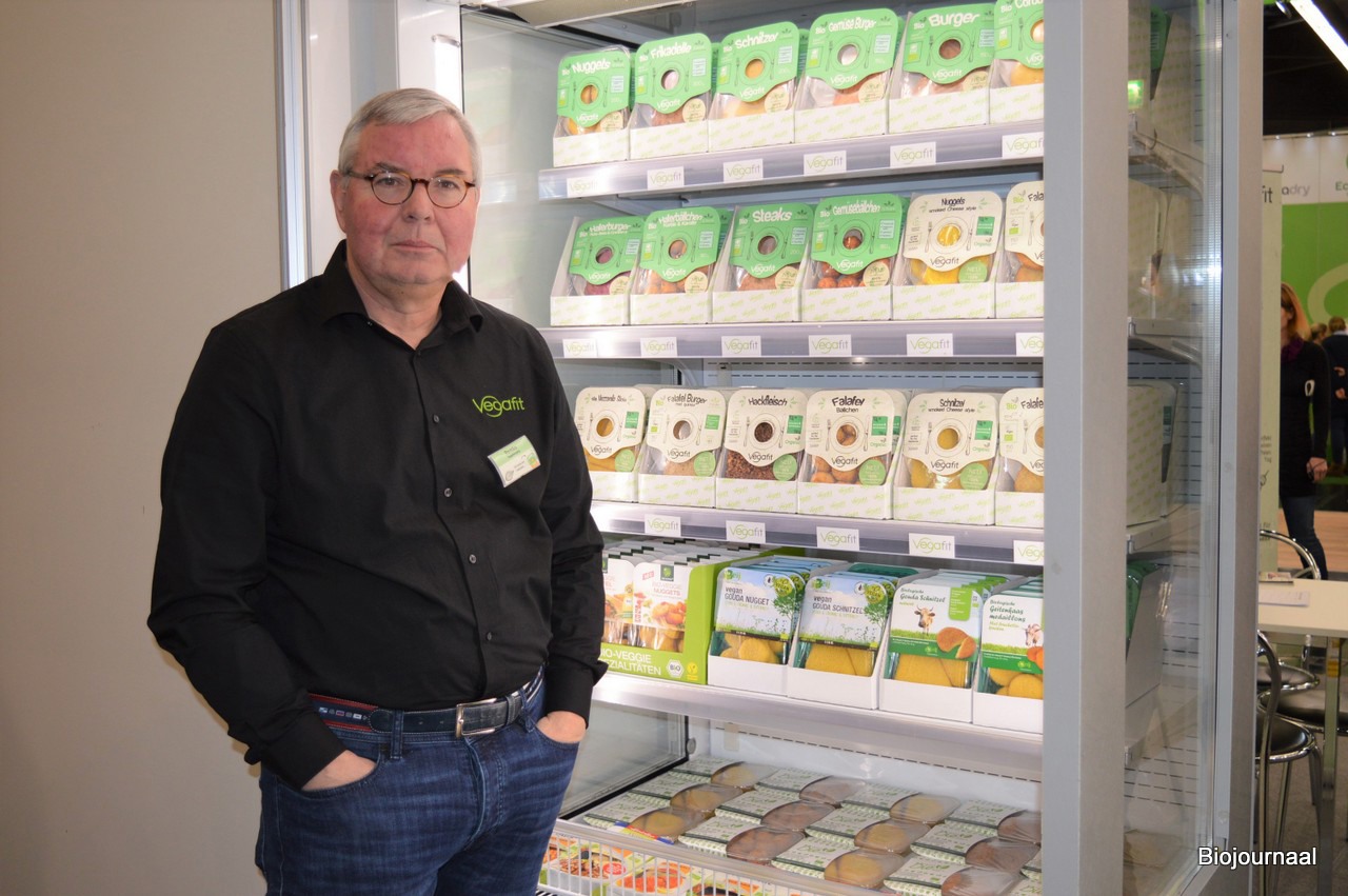 Remko Vogelenzang met achter hem diverse bio-vleesvervangers van Vegafit.