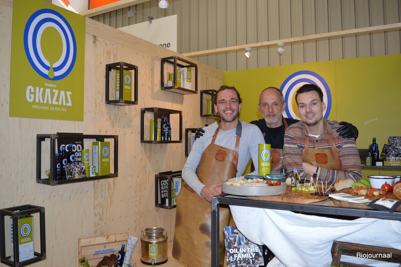 Gkazas Olijfolie debuteerde ook op de beurs in Neurenberg. Op de foto: Tom Reurts, Patric Boogaars en Melle Lindeijer.