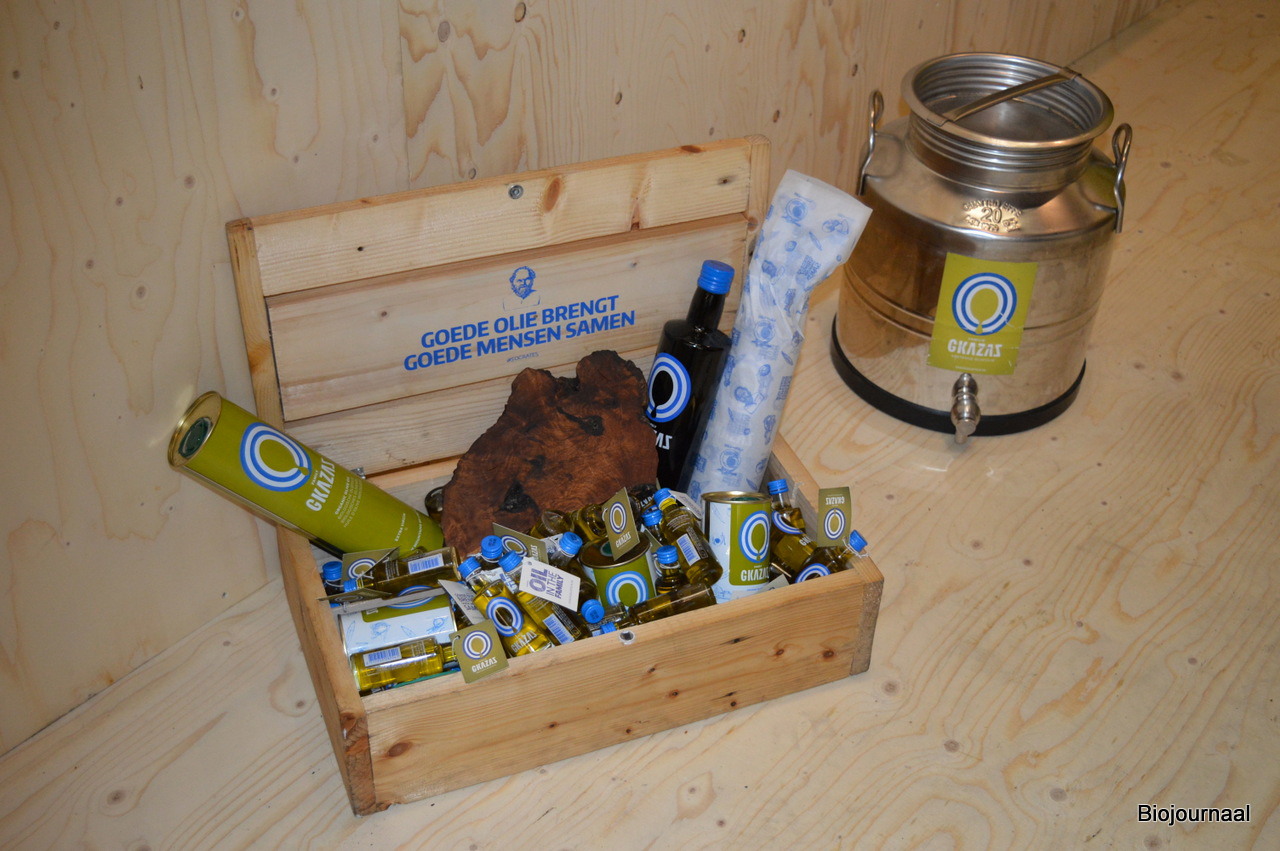 De Griekse bio-olijfolie is zowel in glazen flessen als in blikken verkrijgbaar.