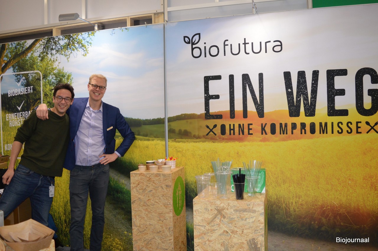 Nog meer Hollanders (in een officieel Duitse stand): Sander Lenselink en Wouter Moekotte van Bio Futura. Wouter vertelde dat er vanwege de extreem warme zomer vorig jaar een tekort aan rietjes ontstond. Nieuw zijn de cups die gemaakt zijn van bamboevezel (op de pilaar naast Wouter).