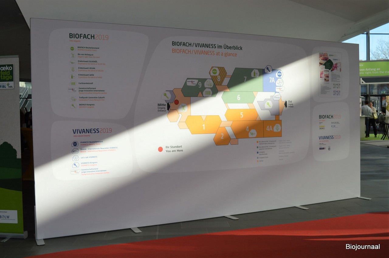 Tijdens deze editie van de BIOFACH waren net als in 2018 deze hallen in gebruik: 1, 2, 4, 4A, 5, 6, 7, 8, 9. De Vivaness was te vinden in Hal 7A.
