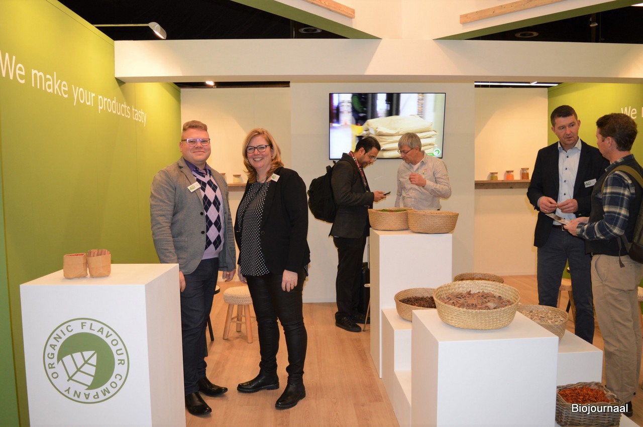Stephan Bottger en Angelien Beek bij Organic Flavour Company. Op de achtergrond (midden) Peter van de Steeg en Edwin van Dieren (rechts). Met de nieuwe stand wilde OFC in een oogopslag duidelijk maken dat bij hen grondstoffen voor de industriële markt verkrijgbaar zijn.
