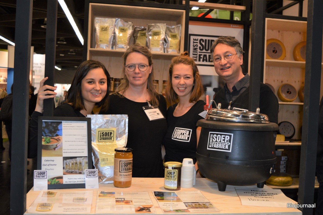 De KleinsteSoepfabriek keerde terug op de beurs. Met in de stand: Thea Jansen, Edith Huizenga, Emma Vroegop en Michel Jansen. Michel: "Het is zo leuk om weer met het merk hier te staan."