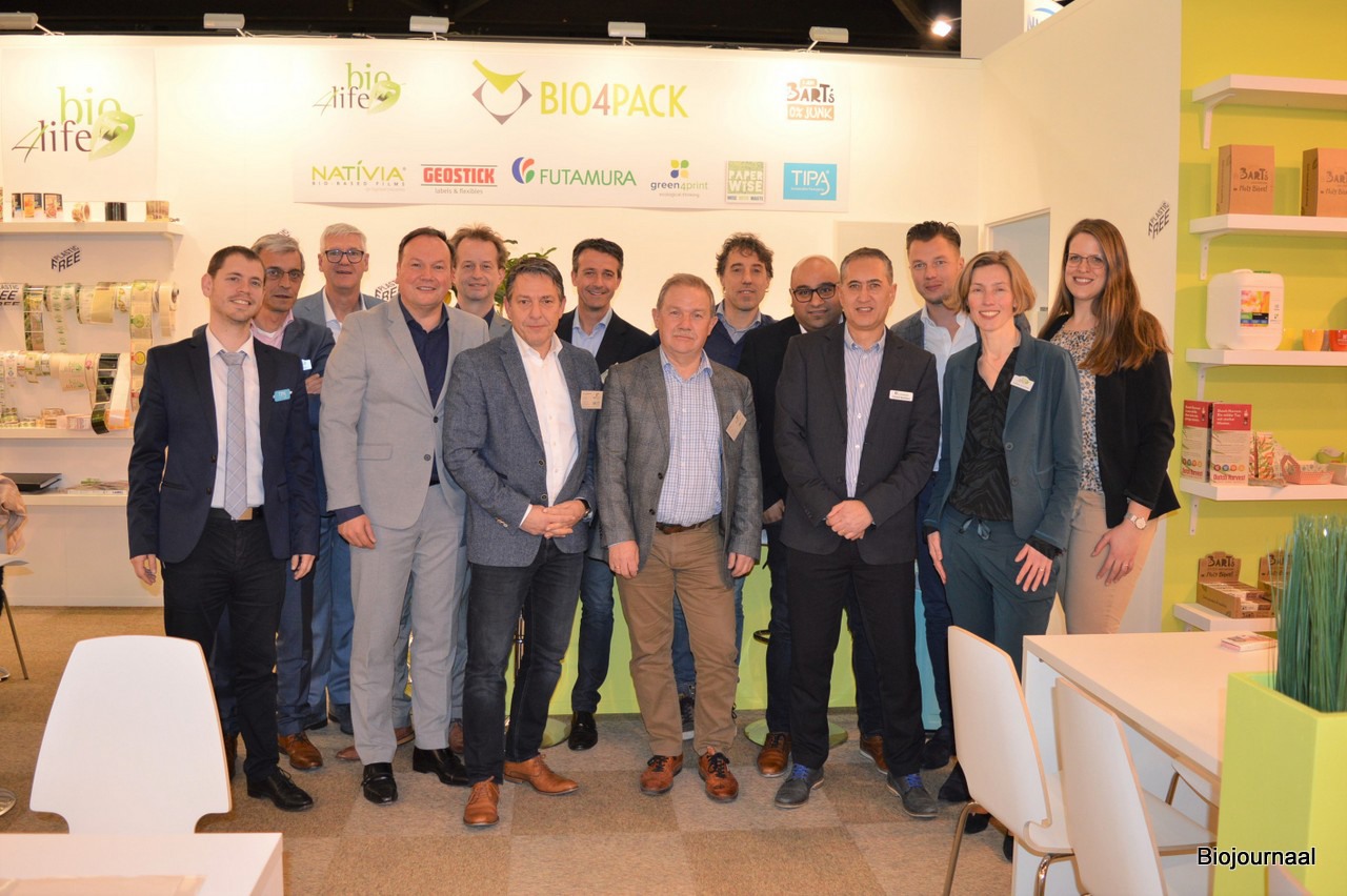 Bij Bio4Pack lieten in totaal 9 bedrijven zien wat zij kunnen betekenen op het gebied van duurzame verpakkingen. Van links naar rechts: Yuval Ben-Yehuda (Tipa), Arjan Klapwijk (Bio4Life), Peter van Rosmalen (PaperWise), Patrick Gerritsen, Jeroen van Schendel (beiden Bio4Pack), Anne van Baardewijk (Green4Print), Nick op den Buijsch (PaperWise), Peter Verweij (Green4Paper en PaperWise), Bart Veldkamp (I am Bart's), Yasar Türkoğlu (Bio4Pack), Gerard Benthem (Futurama), Reinder Rijsma, Yolanthe van de Weg en Martina Jüngerink (alledrie Bio4Pack).