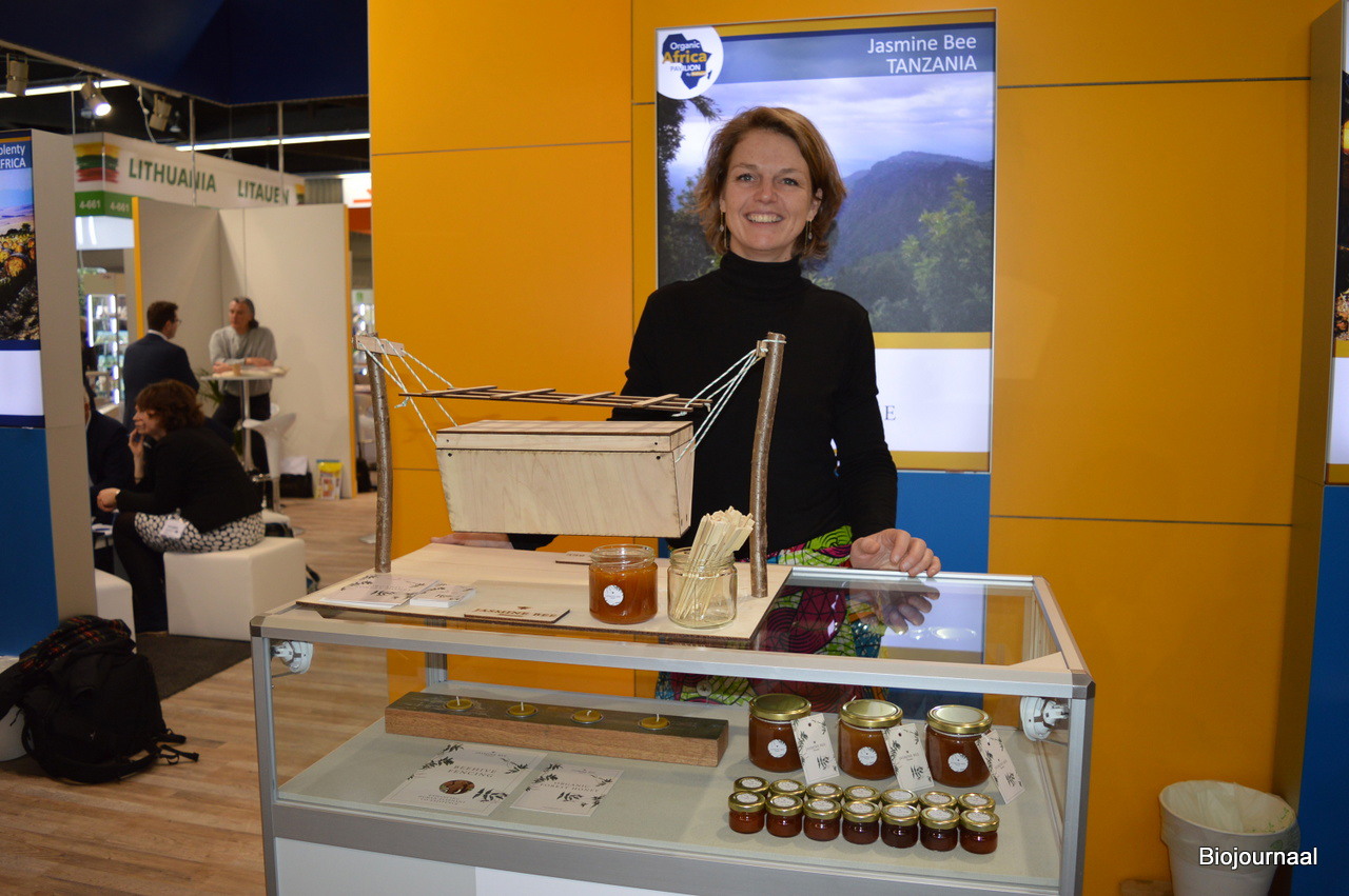 Jasmijn Bleijerveld van Jasmine Bee kreeg in het Organic Africa Pavillion de kans om bezoekers meer te vertellen over de bijzondere honing uit Tanzania. De honing is nu officieel biologische gecertificeerd. Voor haar zie je een bijenkast die gebruikt wordt in het project 'Beehive Fencing', bedoeld om de schade door olifanten op akkers te beperken.