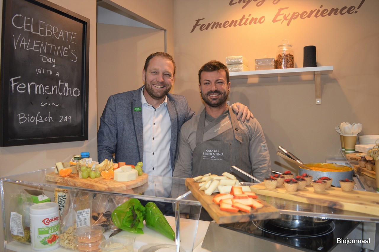 Gert-Jan de Groot vertelde in de stand van Euro Company alles over Fermentino. Naast hem kok Thomas Marsella die allerlei gerechtjes maakte met Fermentino. Fermentino is een plantaardige vervanger van kaas. “Wij maken een alternatief op basis van biologische cashewnoten, water en zout.”