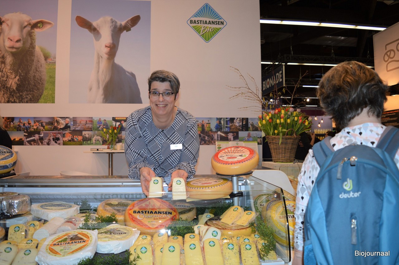 Marja Bastiaansen toont bij Bastiaansen Bio Kaas de stukjes. De nieuwste kazen (Walnoot, Kurkuma en Matcha) konden uiteraard ook volop geproefd worden.