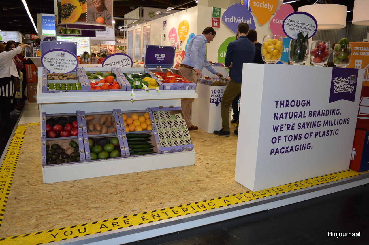 You are entering a plastic free zone'. Op deze manier maakte Eosta duidelijk dat bezoekers bij hen in de stand geen plastic meer aantreffen. In de stand waren allerlei duurzame verpakkingsoplossingen voor biologische AGF te zien.