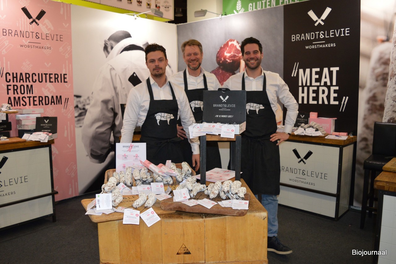 BIOFACH-debutant Brandt&Levie. Op de foto Geert van Wesch, Jasper Kooijmans en Wouter Leeuwenburg. Jasper: "De bezoekers zijn onder de indruk dat deze typisch Italiaanse worst uit Nederland komt. Men is erg enthousiast over de smaak. We willen het hele varken gebruiken, van het vet maken we daarom ook zeep."