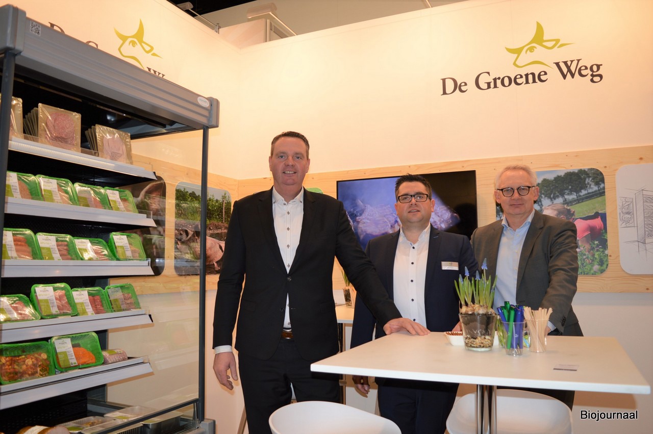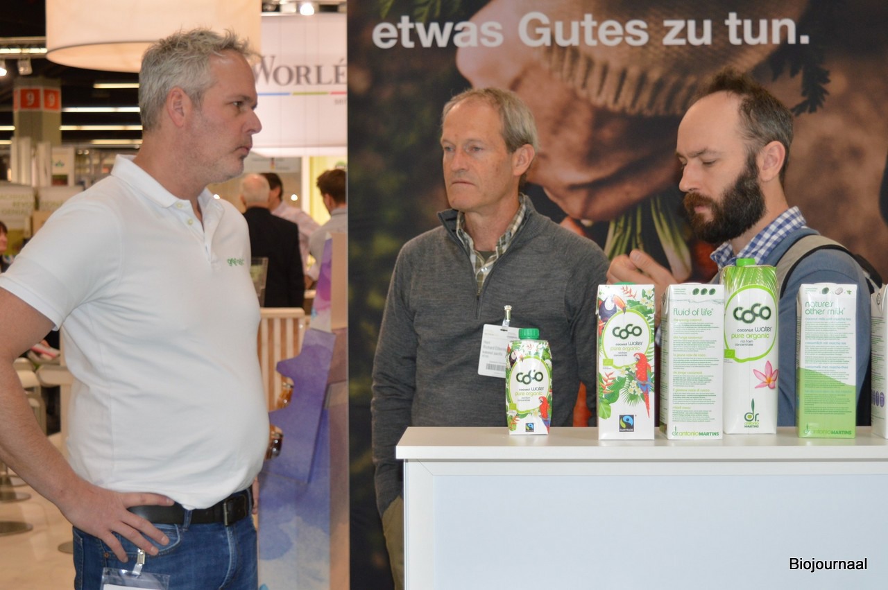 De Nieuwe Weg was in Hal 9 te vinden. Van links naar rechts: Robert van der Kuil, Julian Muller en Marcel van den Meerendonk. Robert: "We kijken tot nu toe met een zeer positief gevoel naar de beurs. Er zijn zeker niet alleen Duitse bezoekers, we hebben ook al de nodige mensen uit onder andere Frankrijk, Italië, Denemarken, Zweden en Nederland gesproken." Voor Marcel was het tien jaar geleden dat hij op de BIOFACH was. Marcel: "Het is mooi om te zien dat de sector sindsdien enorme sprongen gemaakt heeft."