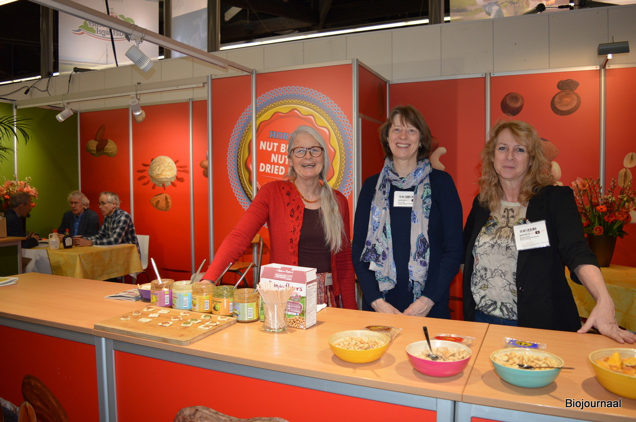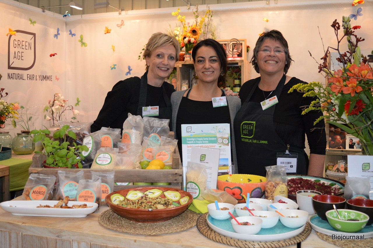De dames in de stand van GreenAge: Wieneke Schröder, Sascha de Lint en Wilma Verschuure. Sacha: "Natuurvoedingswinkels kunnen zich onderscheiden door ruimte te maken voor onze producten in de schappen."