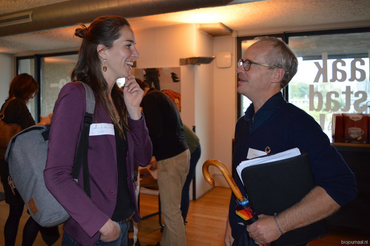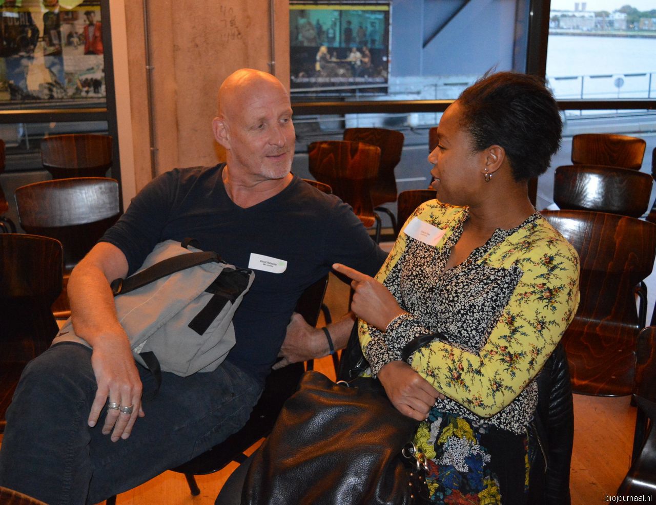 Leonie van der Velden (Bionext) in gesprek met Michaël Wilde, nu nog werkzaam bij Eosta en vanaf november de nieuwe directeur van Bionext.