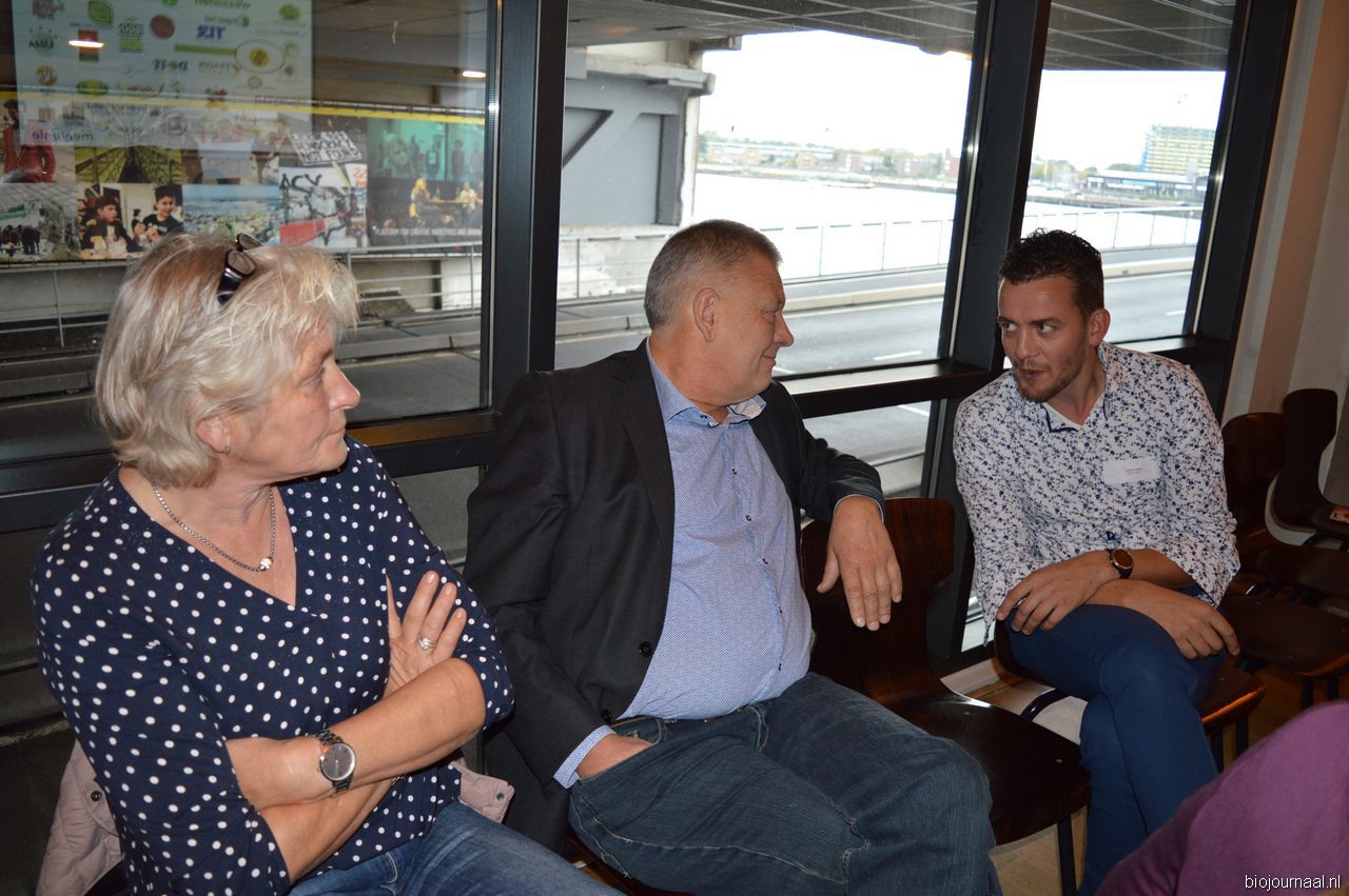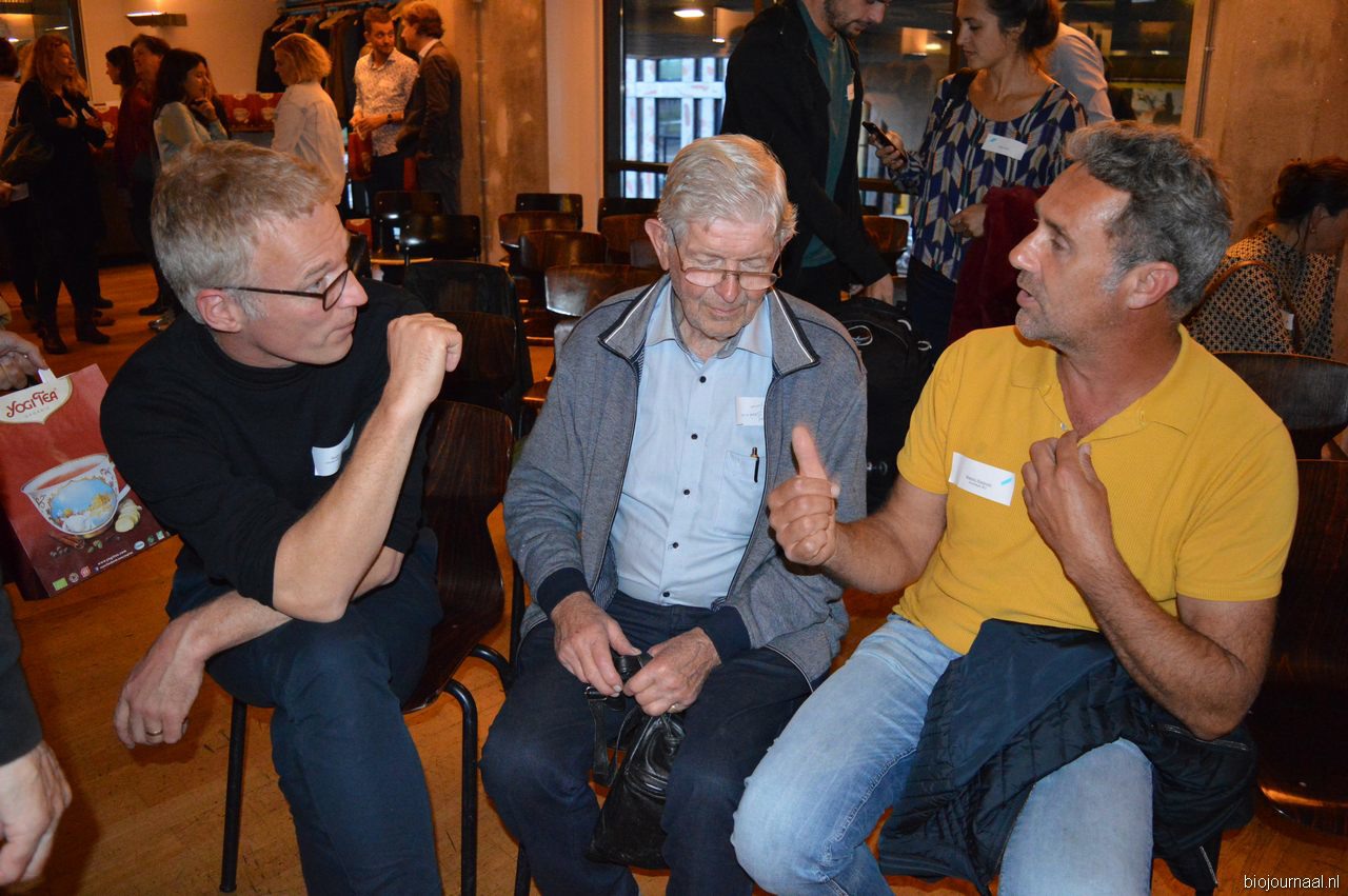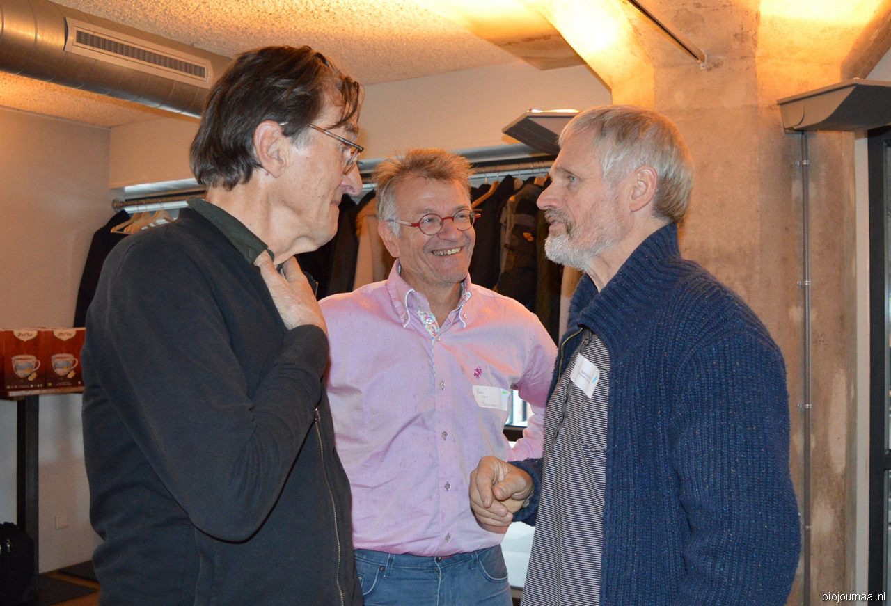Eymert van Manen (mede-organisator BioBorrel), Kees van Zelderen (o.a. bio-melkveehouder en portefeuillehouder Klimaat en Duurzame Energie bij LTO) in gesprek met bio-boer Sjoerd de Hoop.