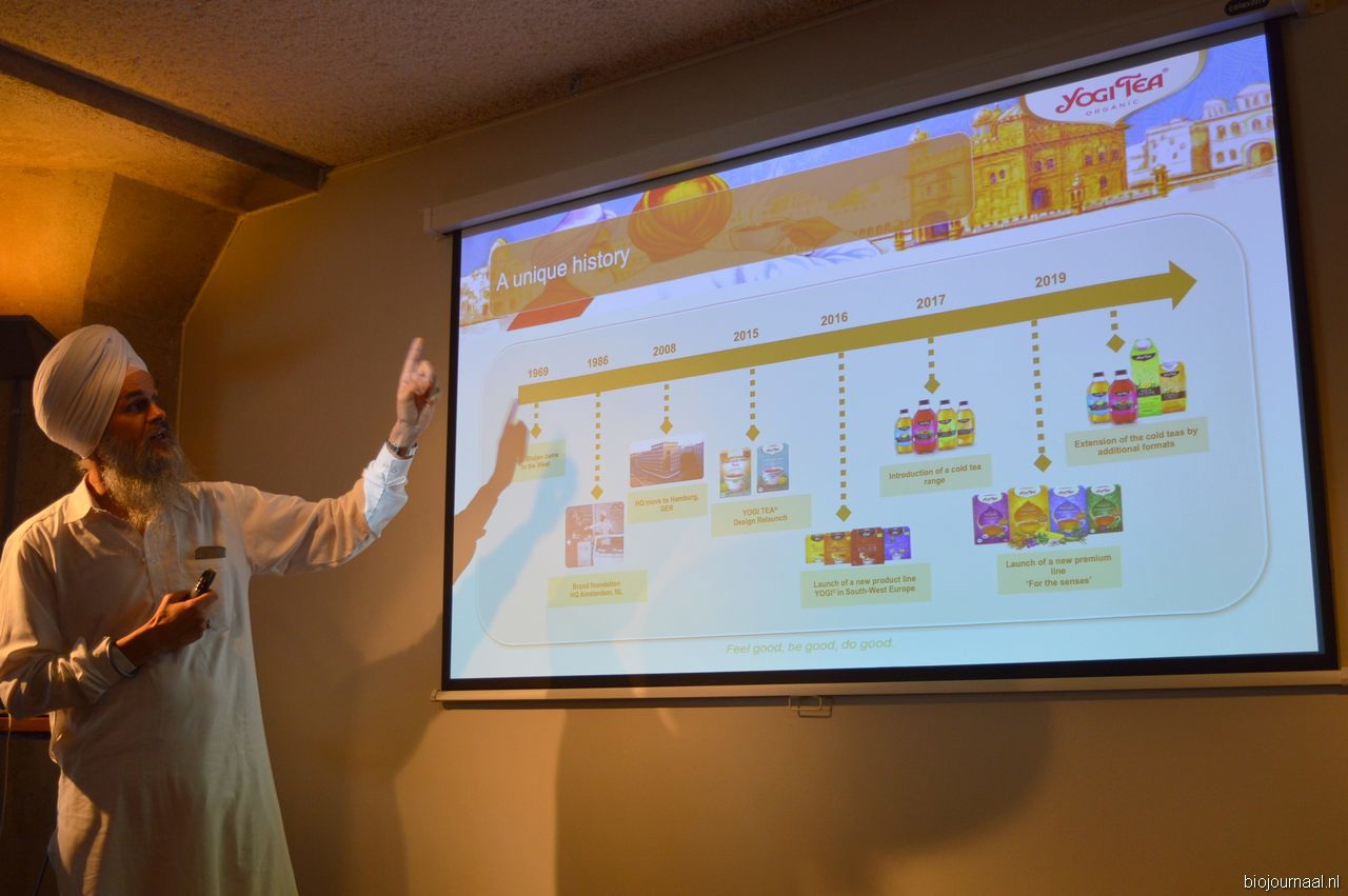 De eerste spreker was Sat Dharm Singh Khalsa, Managing Director van Yogi Tea. Hij vertelde in zijn presentatie meer over de achtergrond van het wereldwijd bekende merk en hoe idealisme en duurzaamheid in een commerciële onderneming ingepast wordt.
