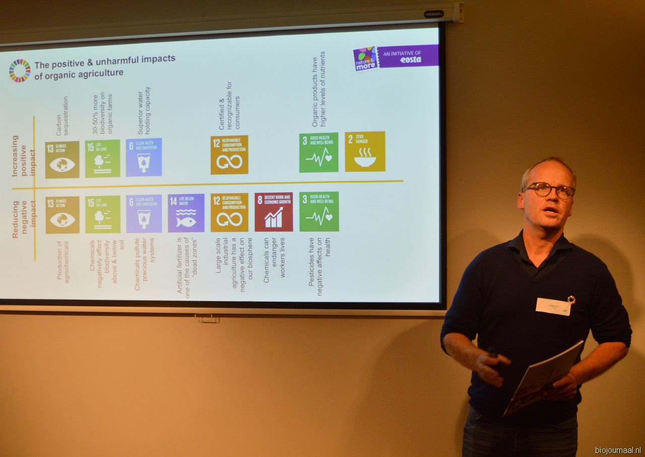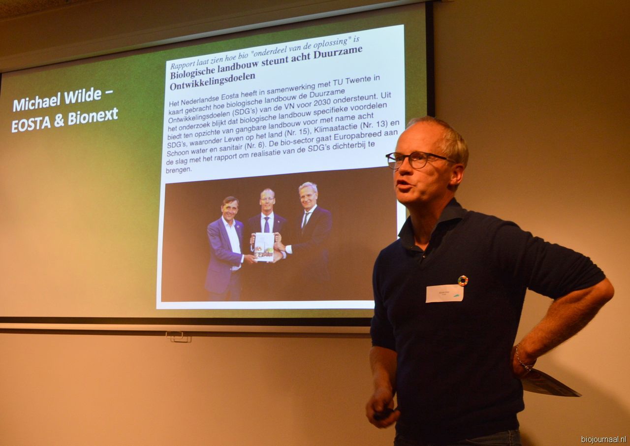 Na afloop van de twee presentaties kreeg Michaël Wilde van Eosta de microfoon overhandigd. De toekomstig directeur van Bionext (vanaf november 2019) vroeg aandacht voor het dinsdag 24 september uitgebrachte rapport waaruit blijkt hoe biologische landbouw de Duurzame Ontwikkelingsdoelen (SDG's) van de VN voor 2030 ondersteunt.
