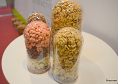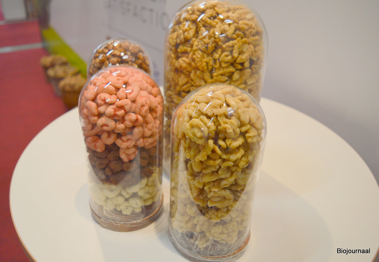 Verschillende stolpen met de noten van Nutto & Frutto. De stolp op de voorgrond is de ‘naked’ walnut, nieuw in het assortiment.
