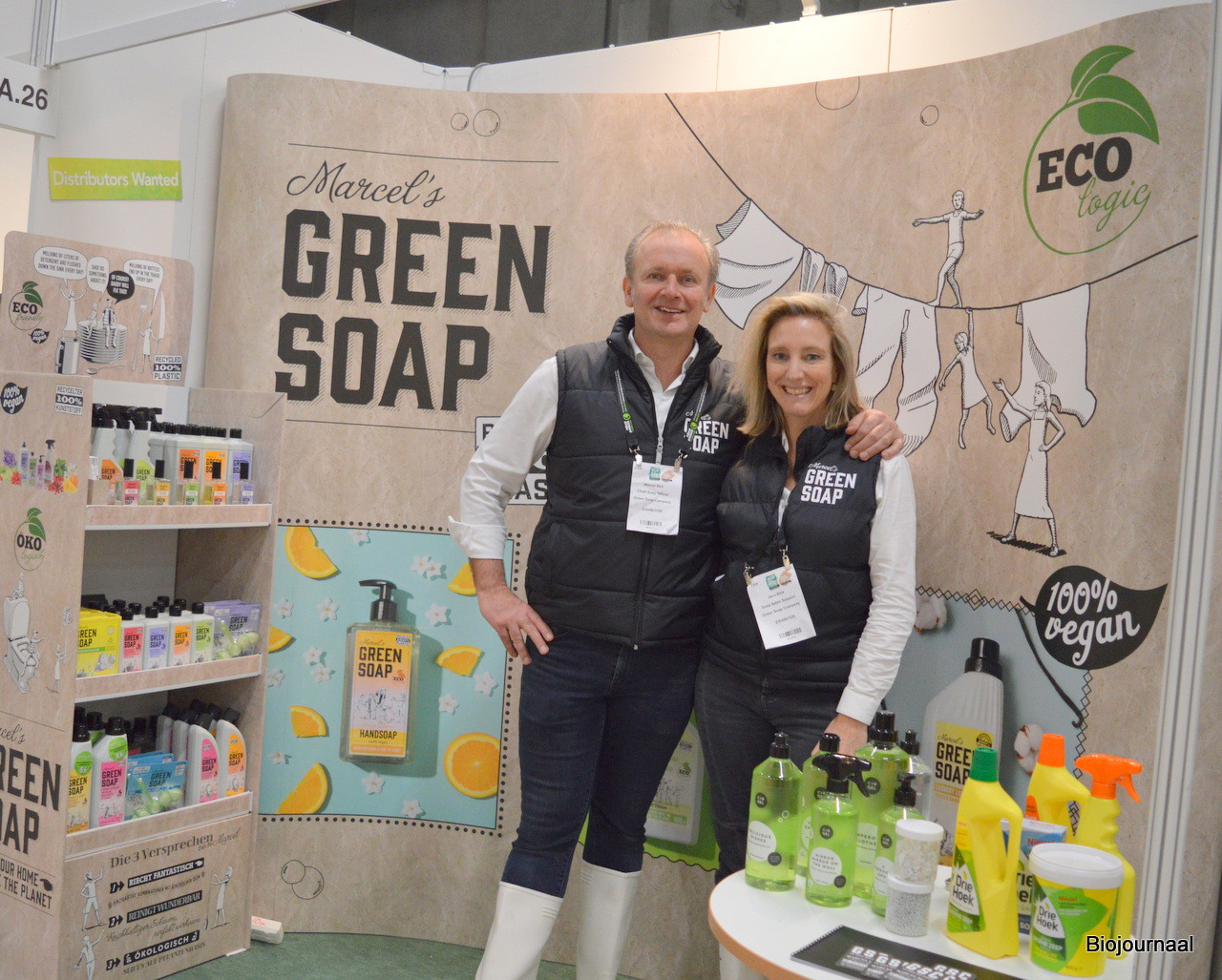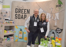 Marcel Belt en Jacomiene Blok van Green Soap Company. Zij staan met verschillende producten uit het assortiment voor het werven van nieuwe klanten.