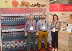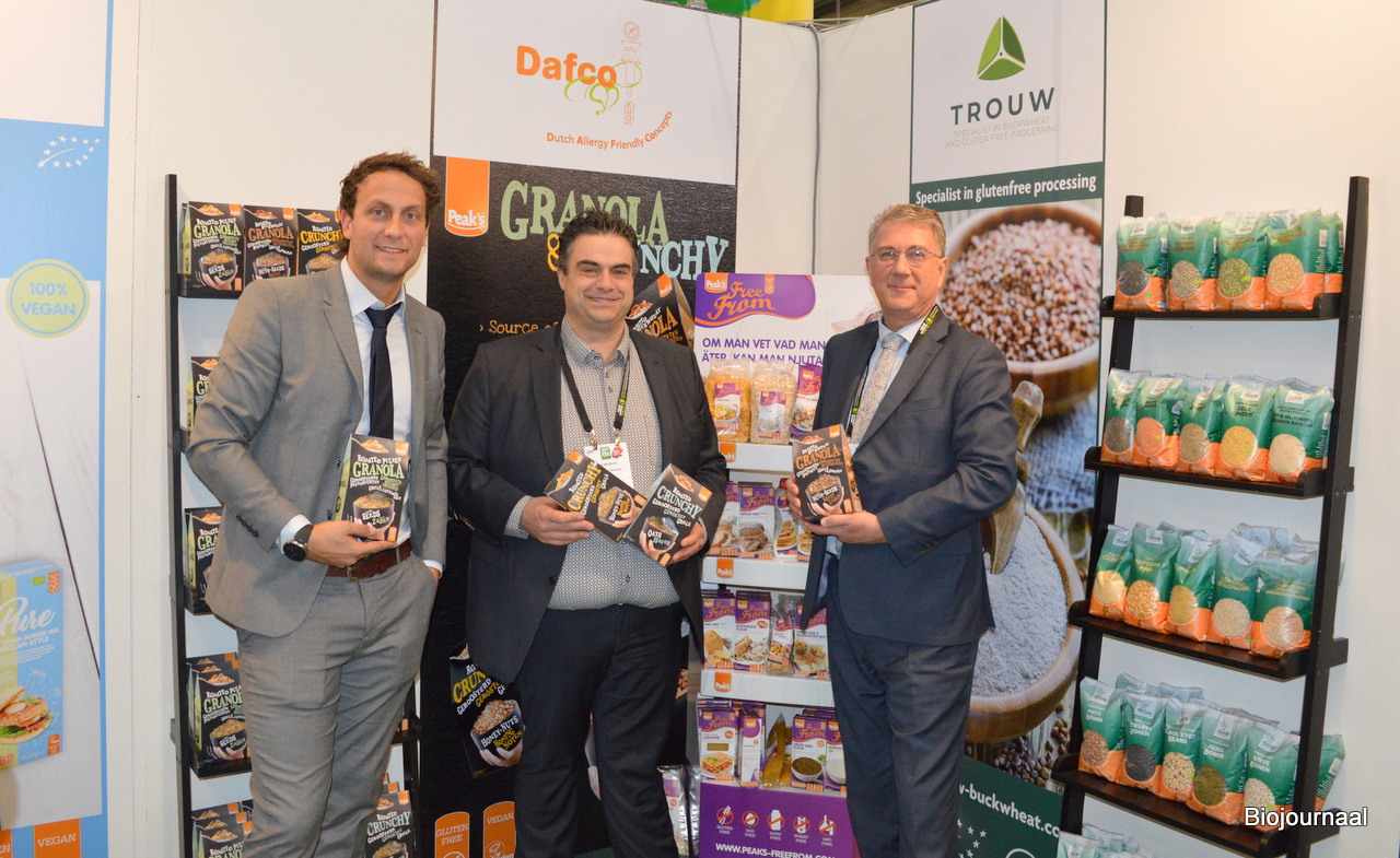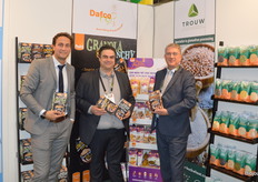 Dafco en Trouw staan verenigd op de beurs. Gino Snoowdijk, Bart Wullems en Dirk Kik poseren met de nieuwe granola producten.