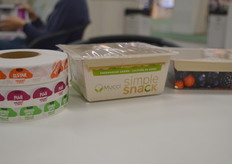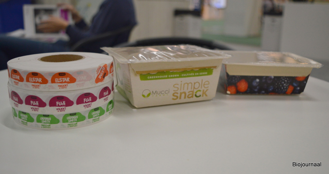 Links nieuwe stickers van Bio4Life, speciaal voor AGF verpakkingen. Rechts twee nieuwe verpakkingen voor de AGF-sector, gemaakt door PaperWise en Bio4Pack.