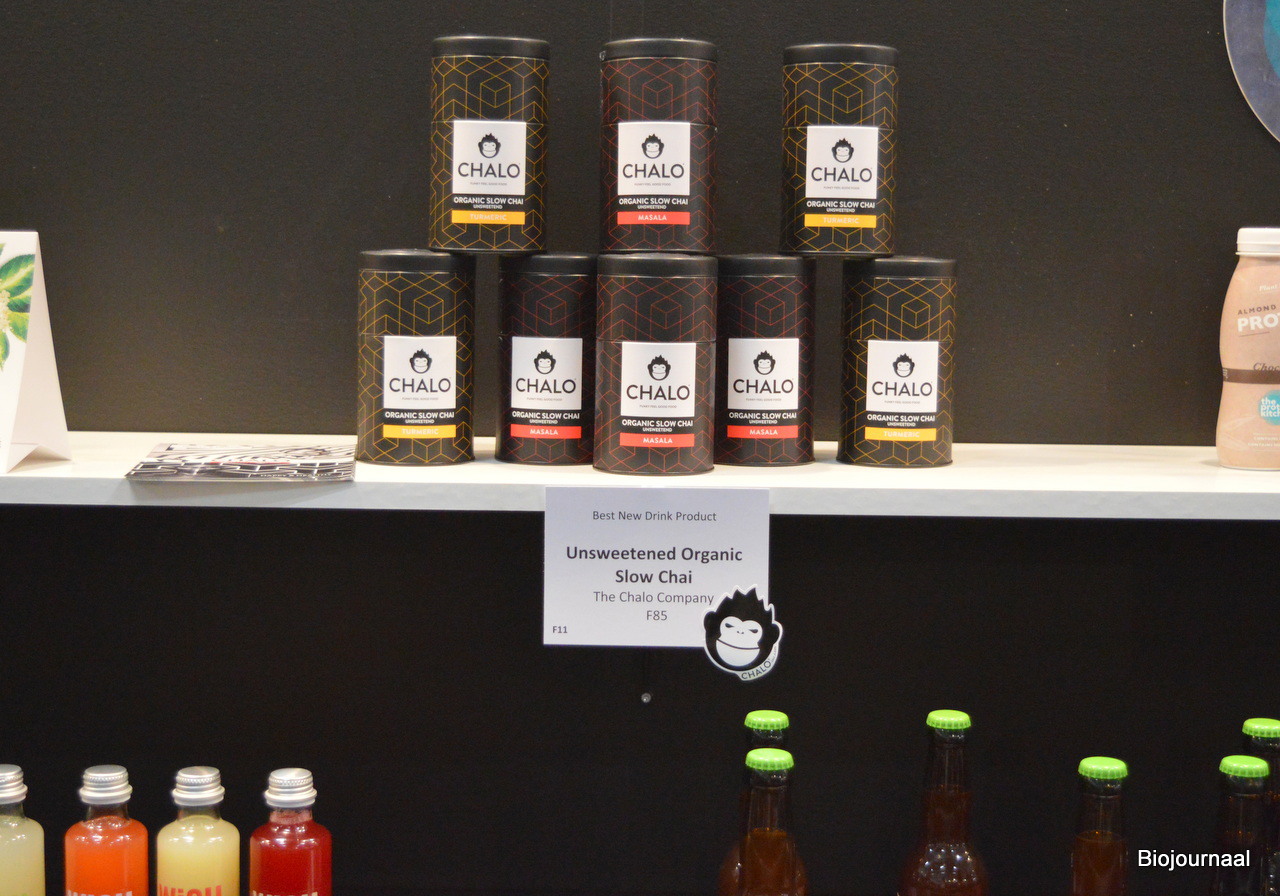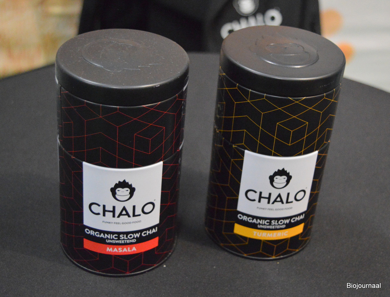 Twee nieuwe soorten thee van Chalo. Met de smaken Masala en Turmeric. In 2020 gaat de Chalo nog meer biologische producten introduceren.