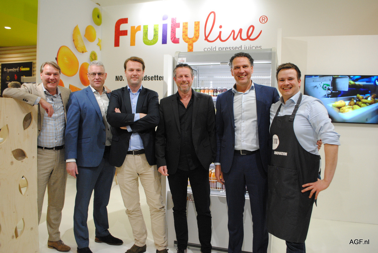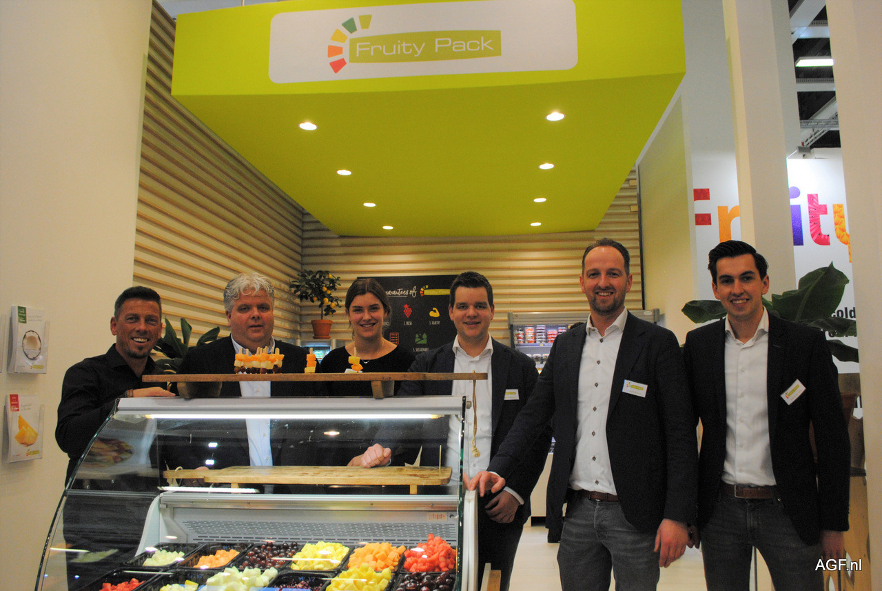 Anton Kooren, Wim Kleinjan, Sharene Kooijman, Wilfred Kleinjan, Leonard de Vries en William de Vries van Fruity Pack bij de fruitbar.