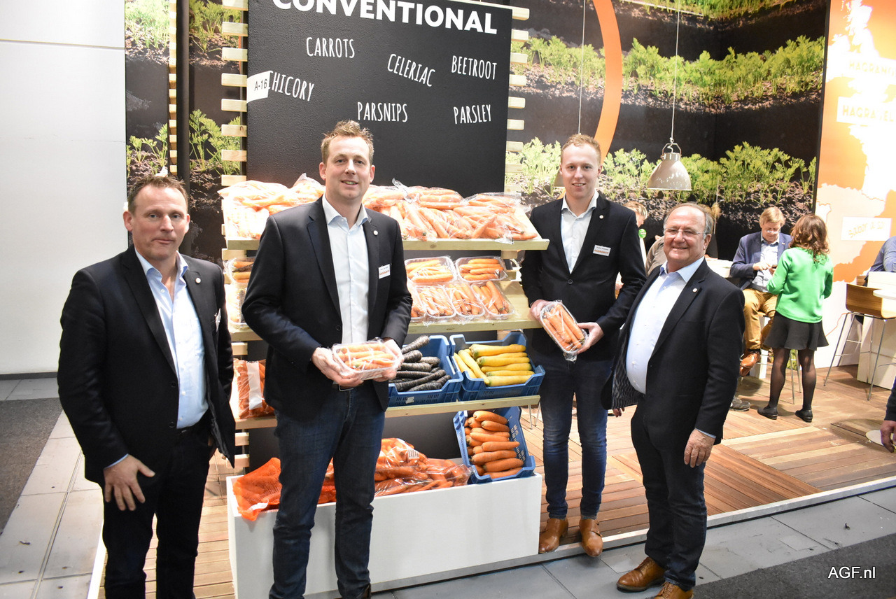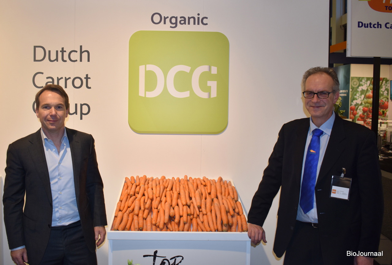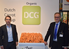 Gerrie Stroeve en Hans Knook poseren naast de biologische wortelen van Dutch Carrot Group. Hebben ongeveer 20% biologische producten in het assortiment.