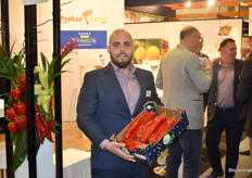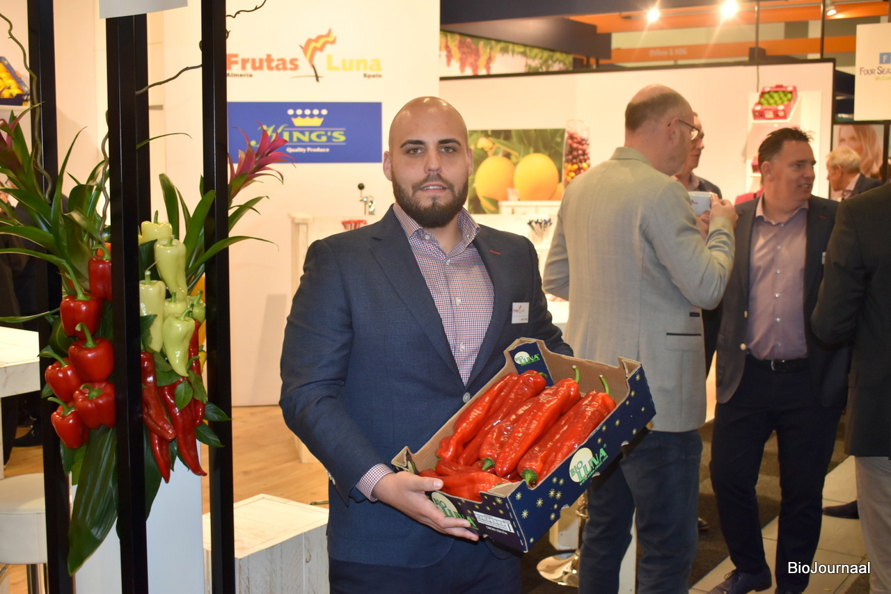 Joey Catita poseert met één van de producten uit het bio-assortiment van Frutas Luna. Frutas Luna heeft eigen productie van diverse groenten en fruit in Almería.