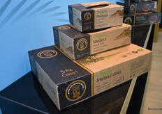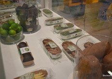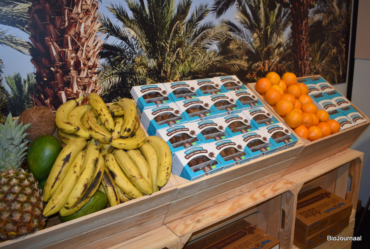 Een voorbeeld display voor de dadel van Yogi&Yousef. Tussen de overige vers producten vallen de frisse verpakkingen goed op.