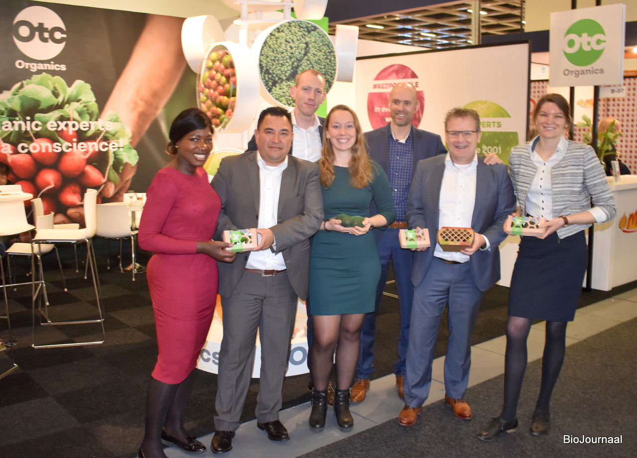 Núria Vlonk, Alexander Restrepo, Kiona van Saarloos, Cornelis Ernst, Edward Out, Bart van der Vliet en Lise Harmsen van OTC organics. Zij geven aan ambassadeurs te zijn voor duurzame verpakkingen.