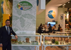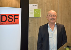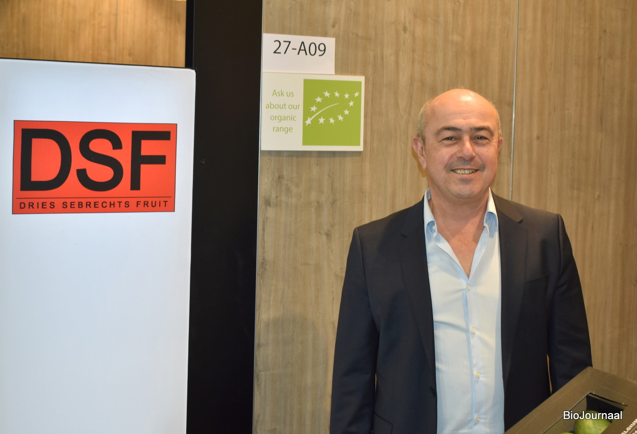 Jan Haegemans van DSF poseert naast het Skal logo. Hebben ongeveer voor 5% biologische producten in het assortiment.