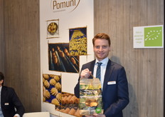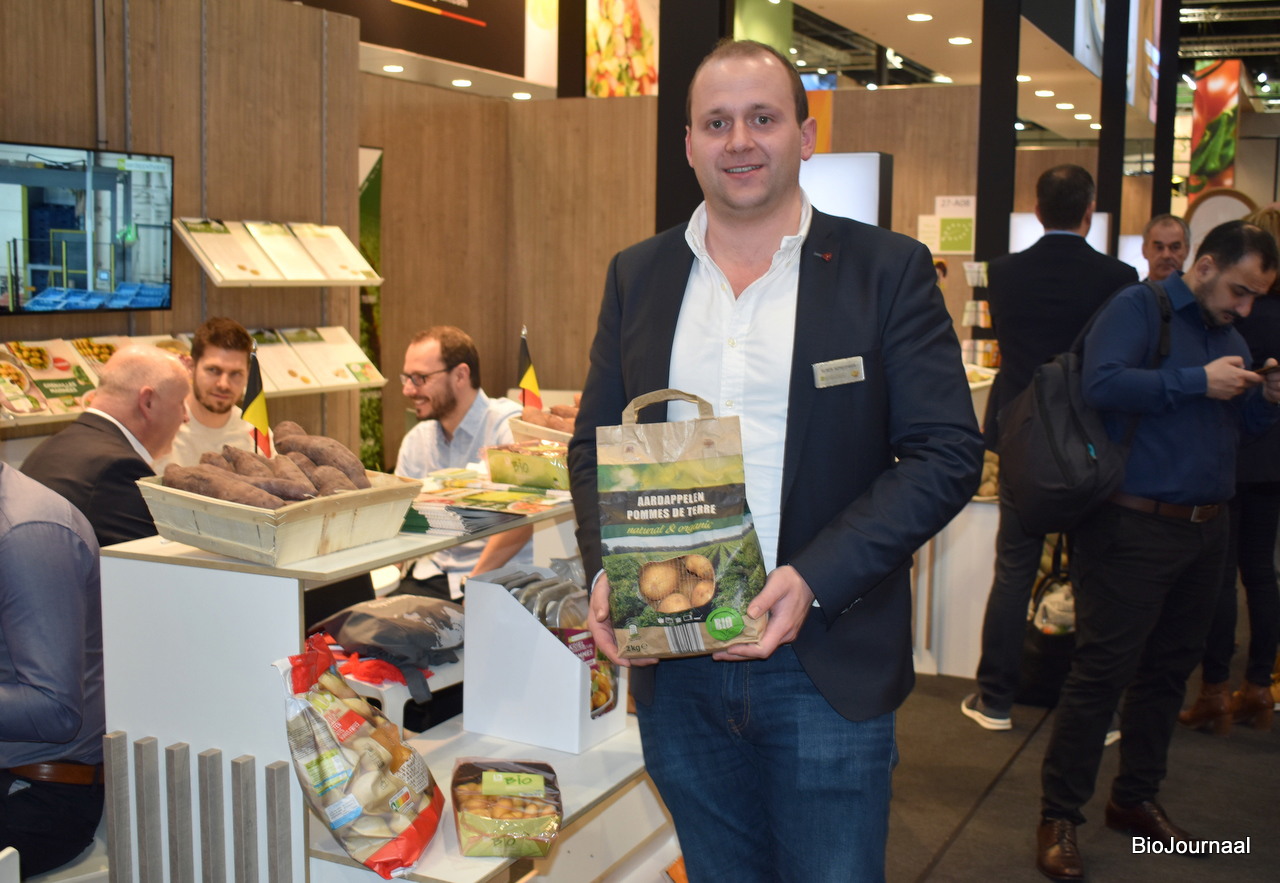 Ruben Nemegheer van De Aardappelhoeve poseert met biologische aardappelen. Hebben ongeveer voor 25% bio in het totale assortiment.