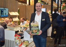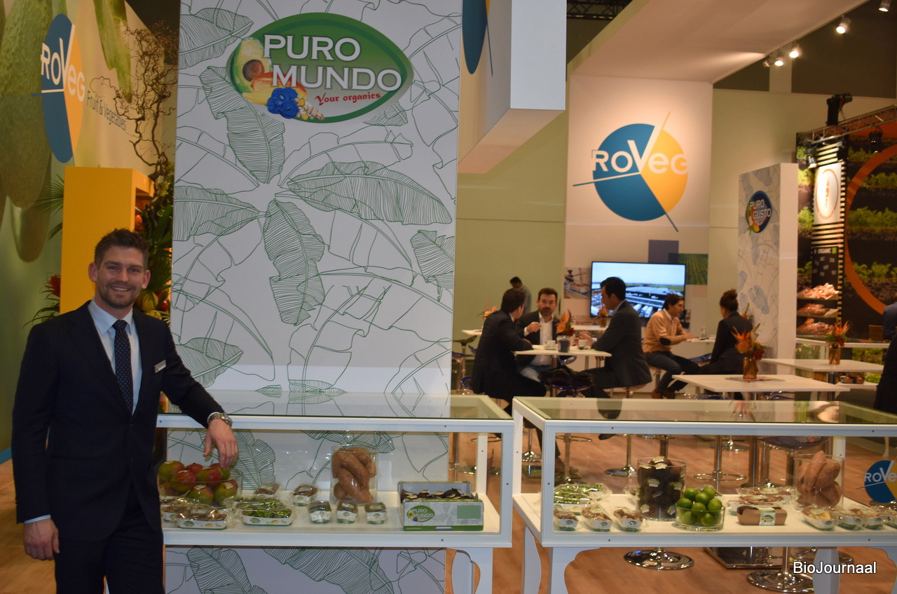 Jeffrey van der Meer van Roveg poseert naast het biologische assortiment, onder het eigen merk Puro Mundo.