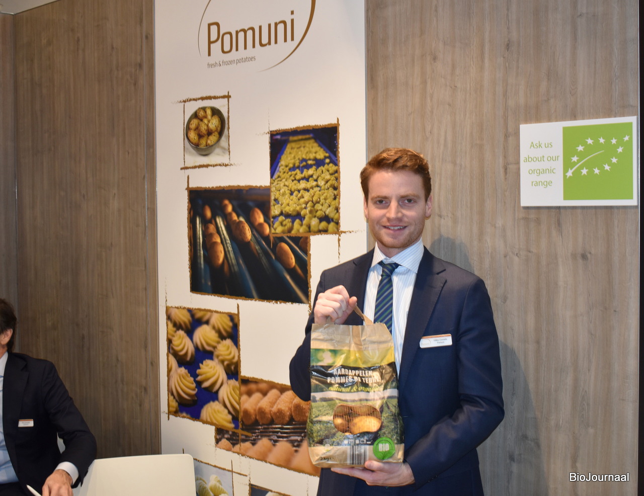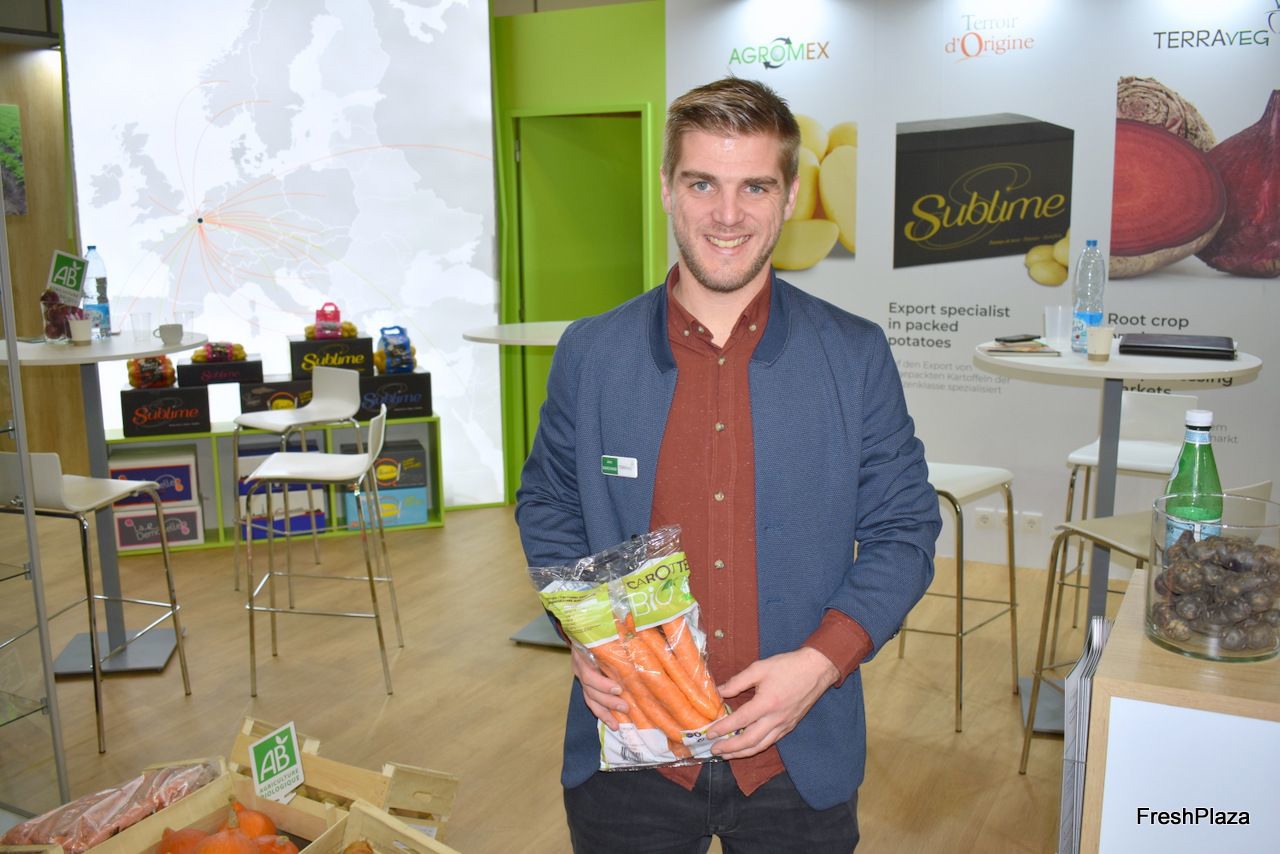Jean Marchand van Terraveg poseert met biologische wortelen. Agromex, Terroir d’Origine en Unibio waren ook aanwezig op de stand.