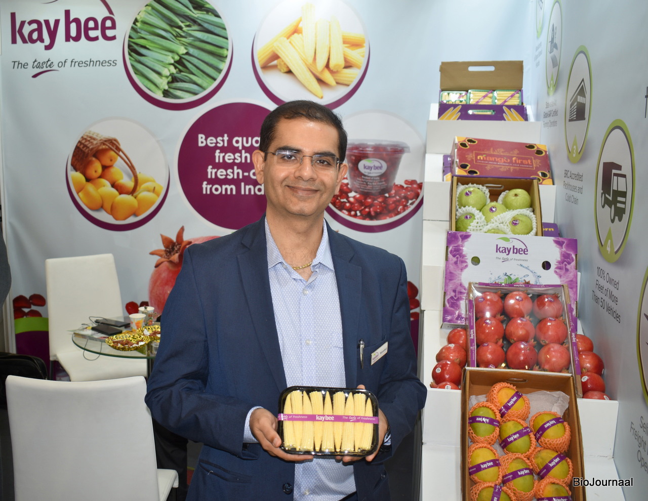 Kaushal van Kaybee poseert met de biologische baby corn.