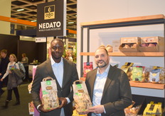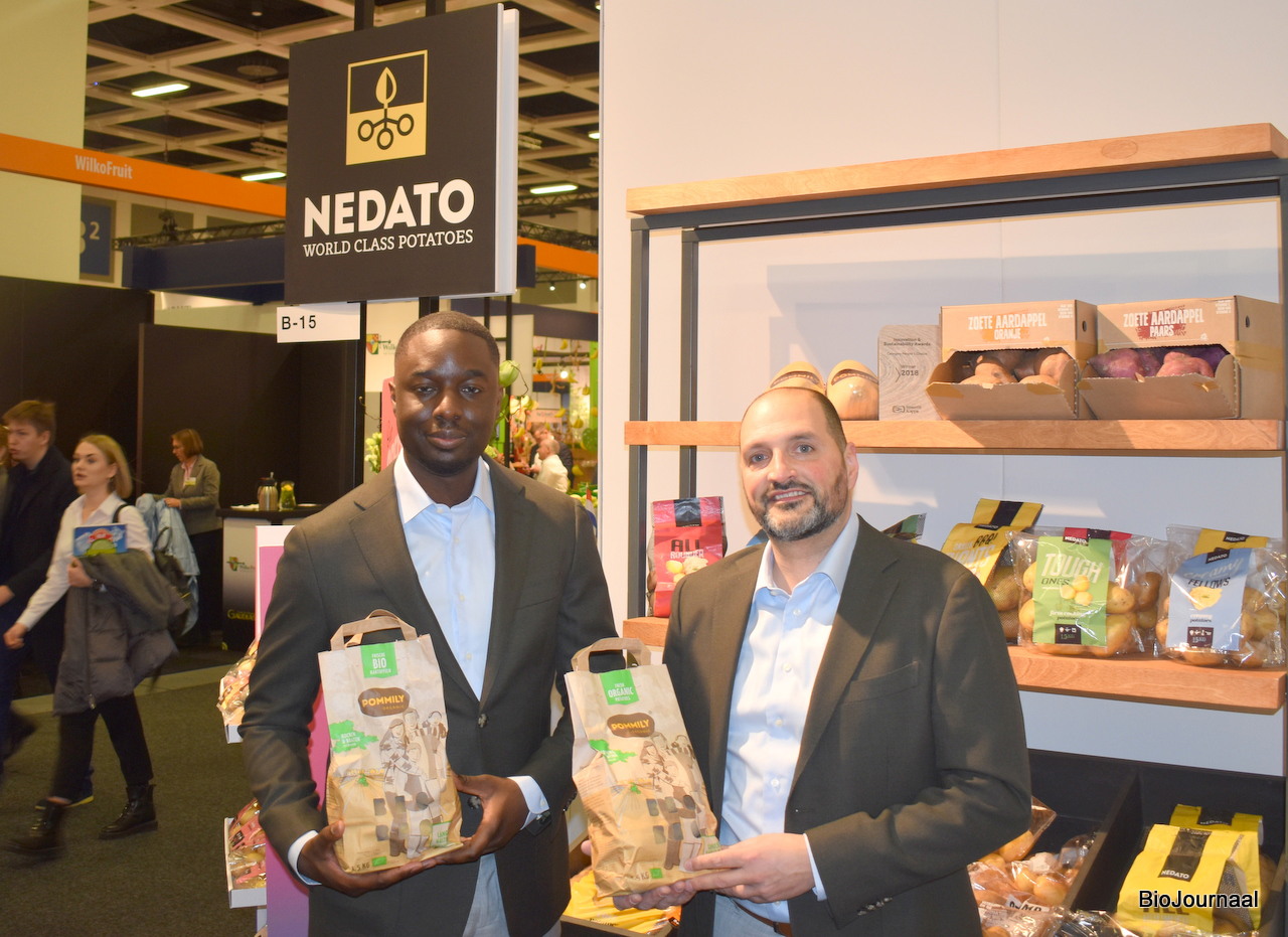 Muhammad Semega Janneh en Miguel Avila Delgado van Nedato poseren met de biologische Pomily aardappelen.