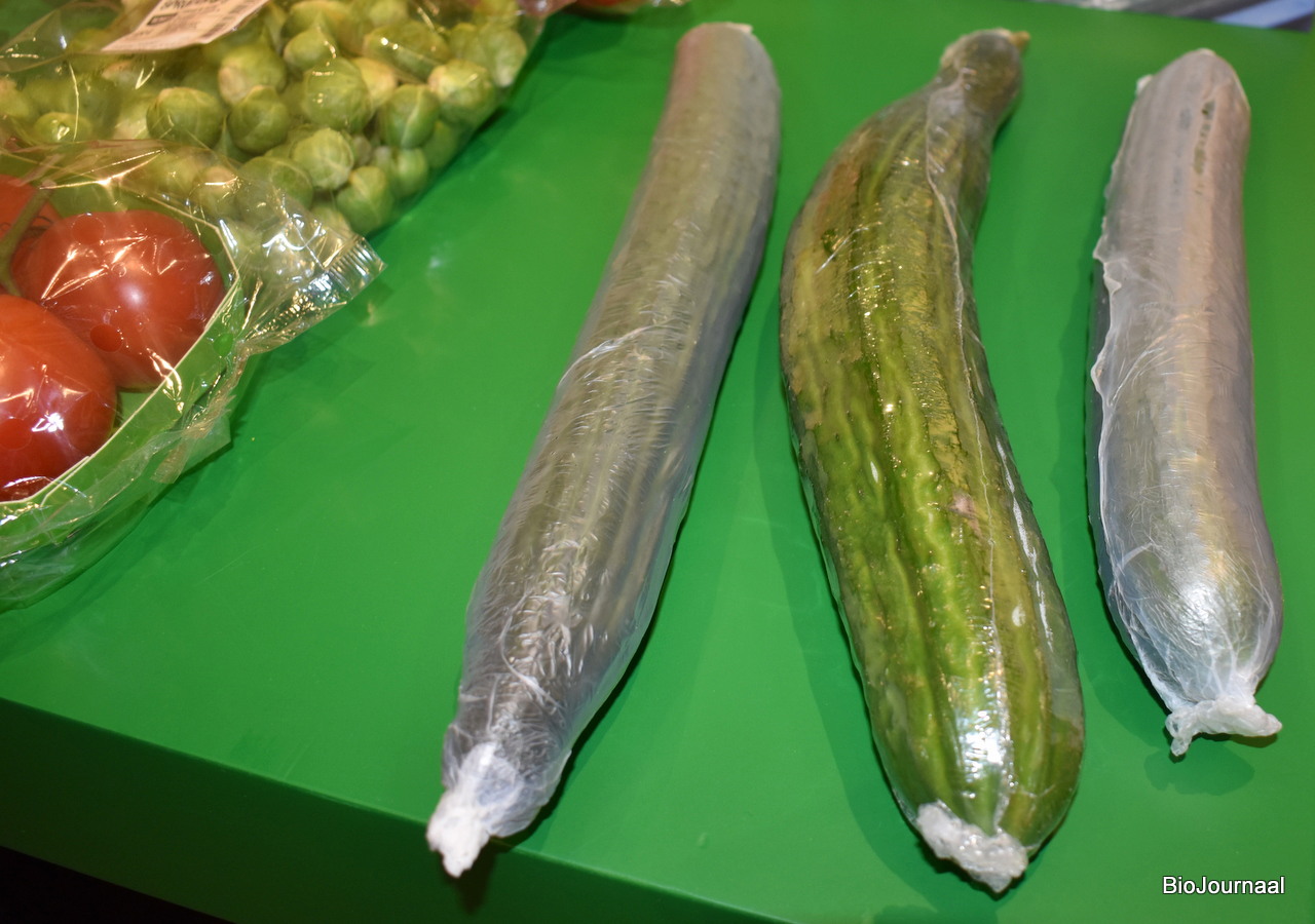 De middelste komkommer is verpakt in gangbare verpakking en de buitenste in de biologische verpakking van Oerlemans Packaging.