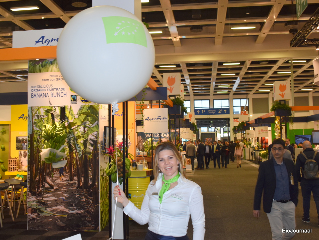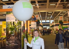 Danielle Rouwen van Urfruit poseert naast de ballon met Skal logo. De bezoekers konden zo gemakkelijk de stand vinden.