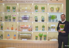 Roy van den Heuvel van Argos poseert met de duurzame papieren inlegvellen voor AGF-producten.