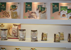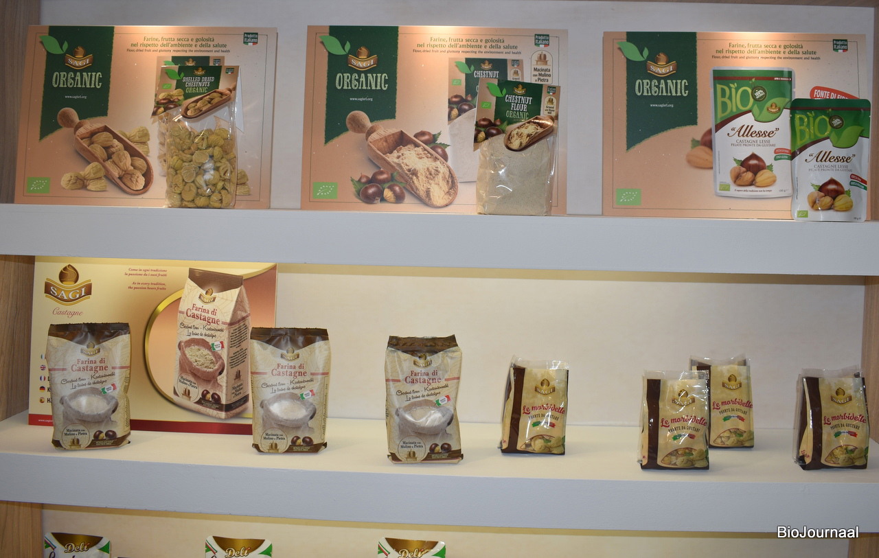De bovenste producten zijn biologische producten van Sagi. Links gedroogde noten, in het midden bloem en recht gekookte noten.
