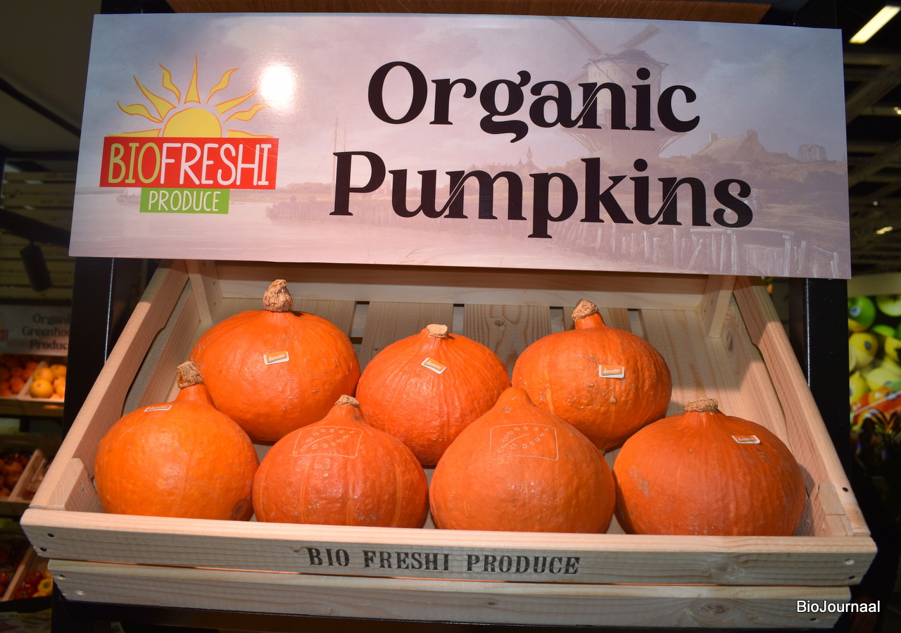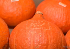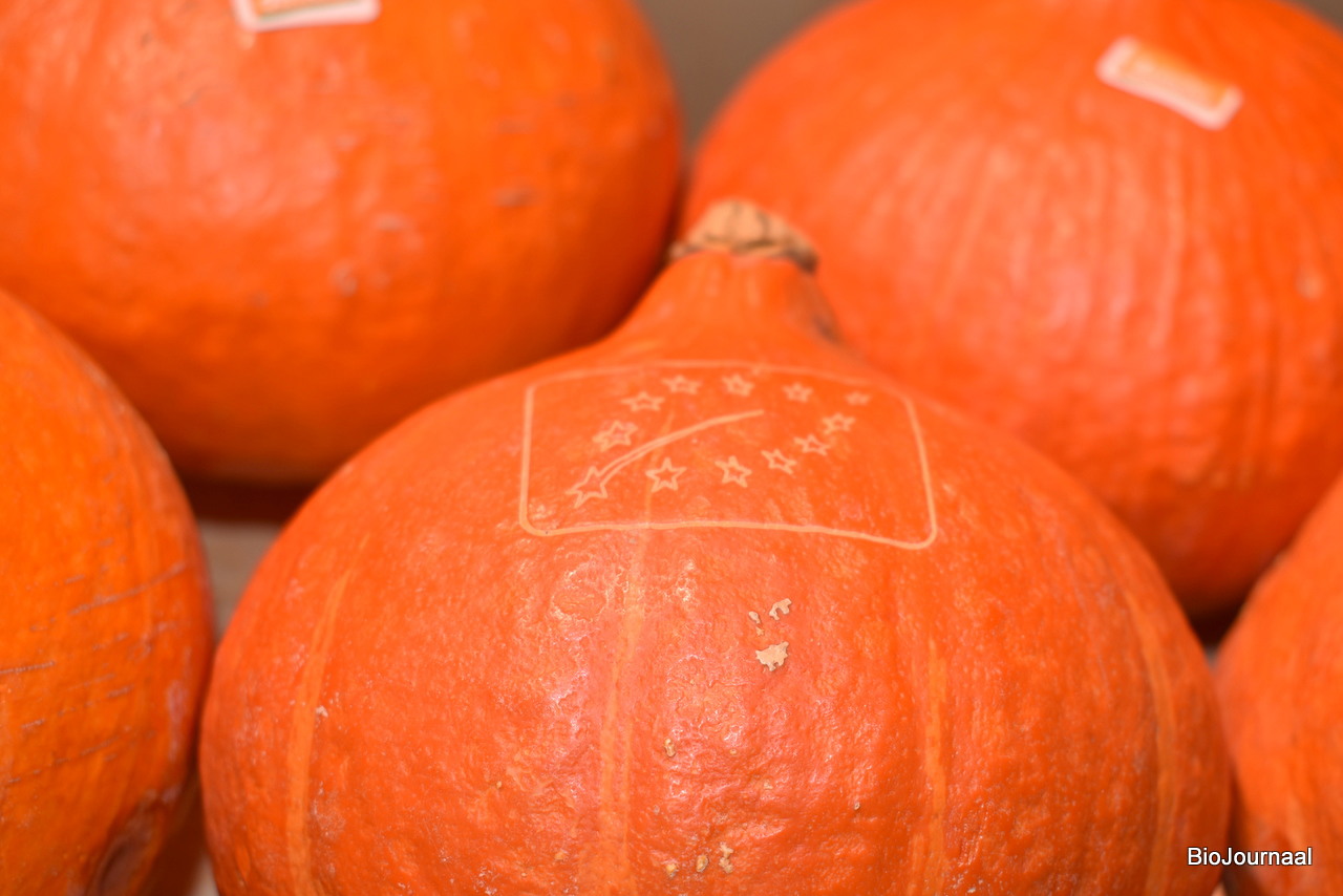 Biologische pompoenen van Bio Freshi, met het Skal logo erin gelaserd.