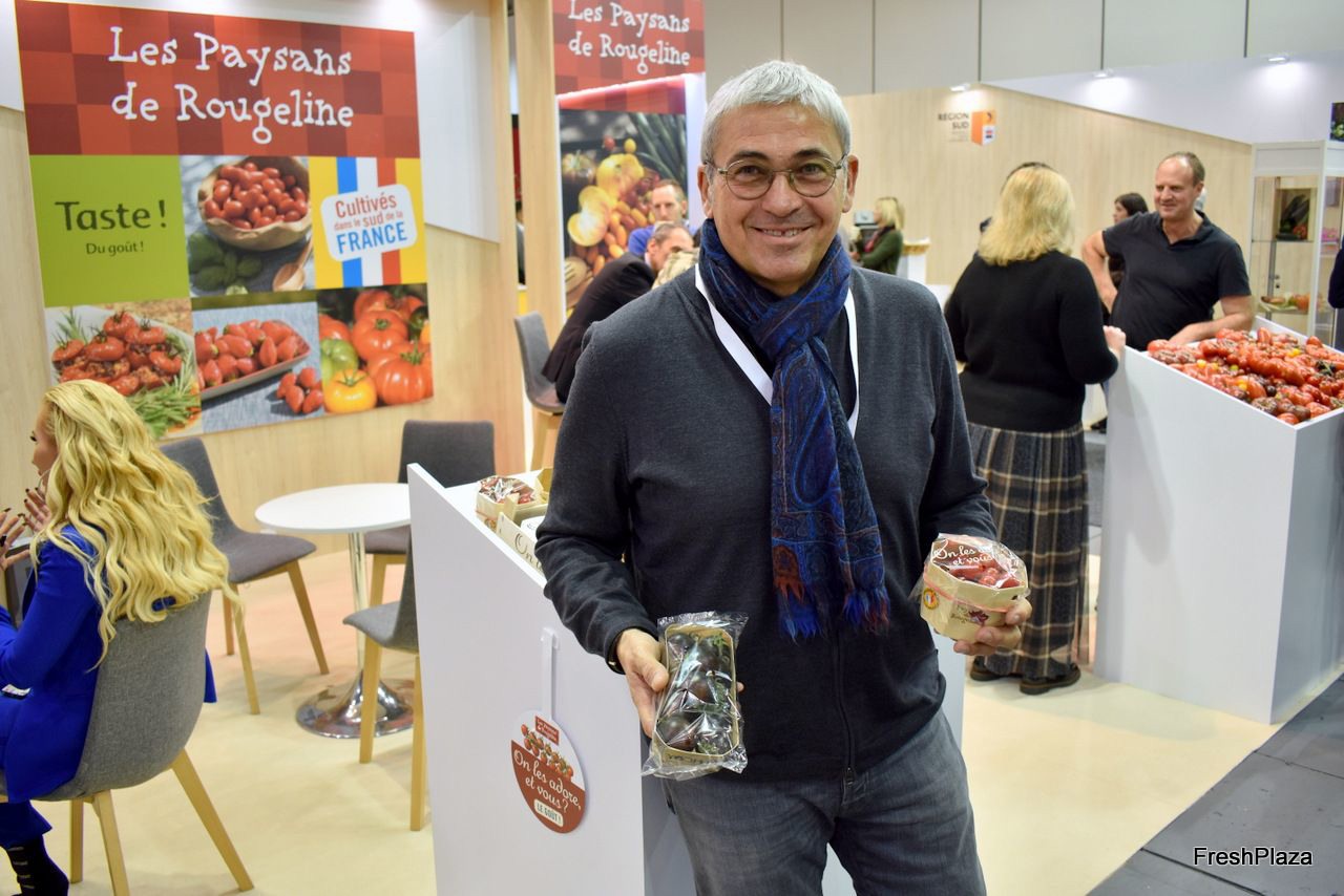 Philippe Fort van Rougeline poseert onder andere met de Yoom tomaat, een variëteit van Syngenta. Dit jaar won de tomaat de Fruit Logistica Innovation Award.
