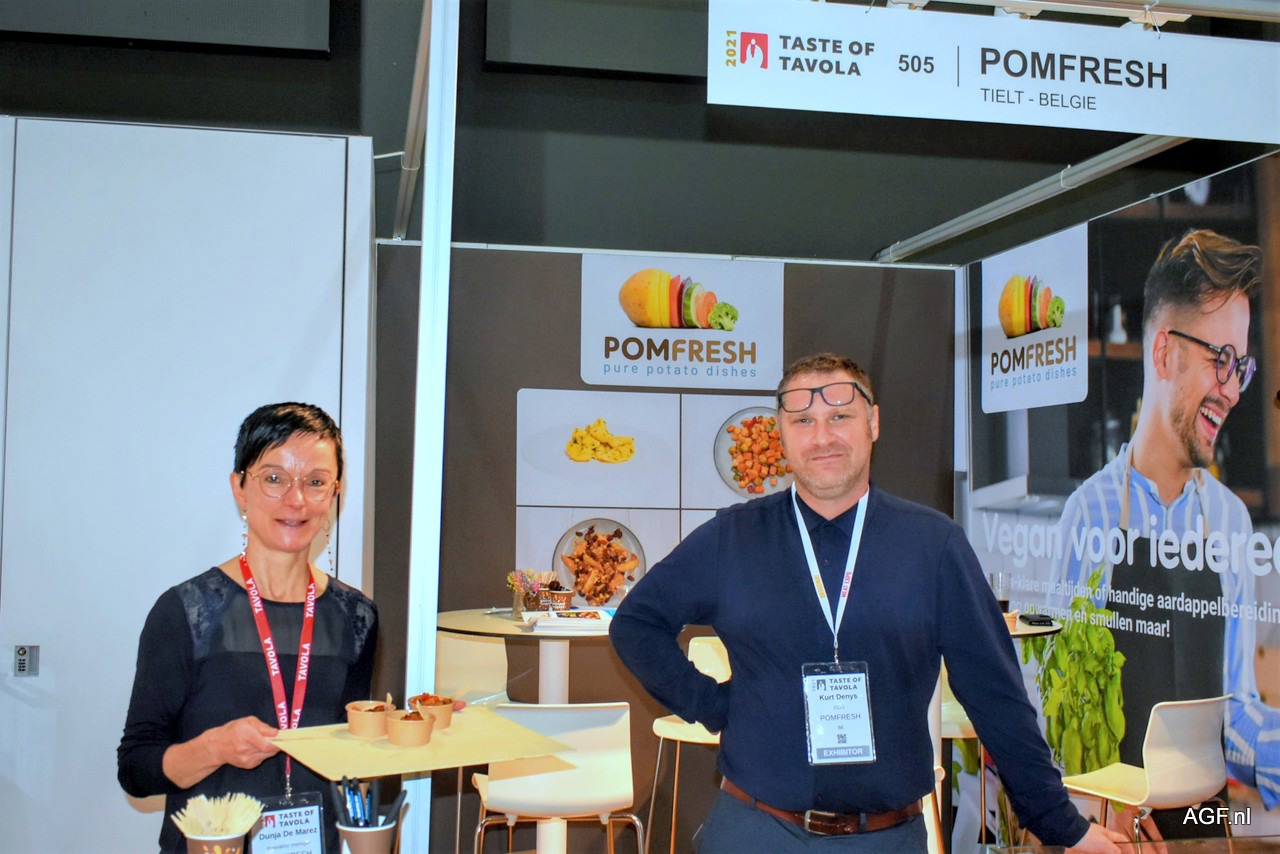 Dunja De Marez en Kurt Denys van Pomfresh, een afsplitsing van Warnez Potatoes. Dunja: "We hebben een nieuwe lijn met vegan kant-en-klare maaltijden ontwikkeld en en waar we vroeger toch veel grotere verpakkingen deden, komen deze handig vier wereldse smaken in éénpersoonsverpakkingen." De op aardappel gebaseerde maaltijden komen in de smaken American, Indian, Mexican en Provençal en bevatten naast de pieper een variëteit aan groenten.