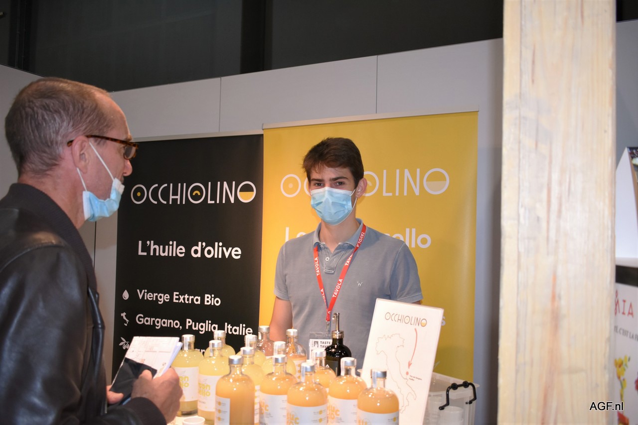 Occhiolino brengt België en Italië bij elkaar met onder andere limoncello en olijfolie en ook nog eens een volledig biologisch assortiment. Althans bijna. "De Succo is voor 90% bio, want de honing levert mijn broer en die heeft niet die kwalificatie", zegt de enthousiaste standhouder Guillaume Duchesne.