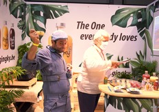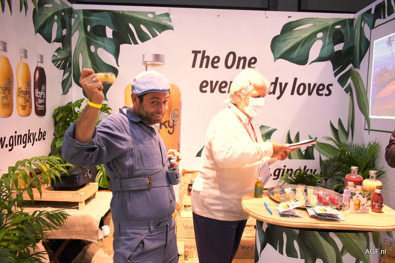 Gingky Ginger, oppeppende gembershots. Five Star Foods heeft de productie op zich genomen van deze door Samuel Droeshaut ontwikkelde gembersappen. Samuel staat hier samen met Fabienne Tedesco.