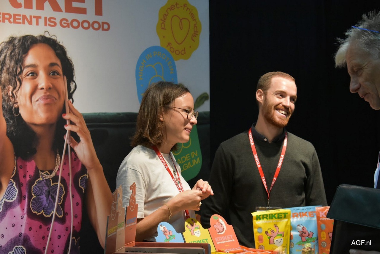 Kriket promoot onder andere haar nieuwe Granola op de beurs. Ook Kriket heeft een volledig biologisch assortiment. Anneleen Van Meervenne en Antoine Roba vertellen enthousiast over hun producten, die toch vaak wat 'out-of-the-box' zijn. Enthousiast vertelt Anneleen over hoe ze dit bedrijf samen met haar broer runt en de nieuwe markten die ze aanboren. Zo is Kriket leverancier van zoutsnacks geworden bij AS Adventure.