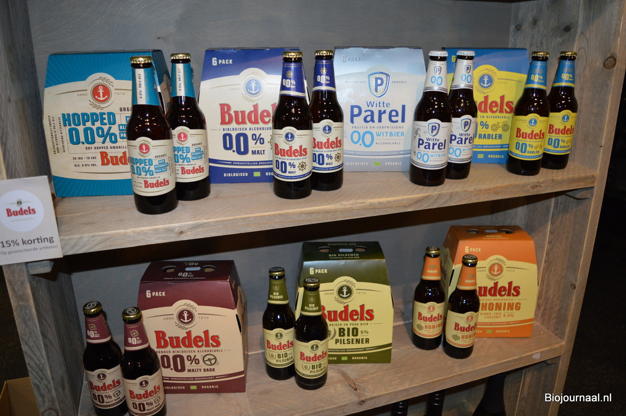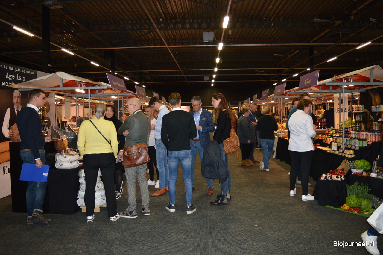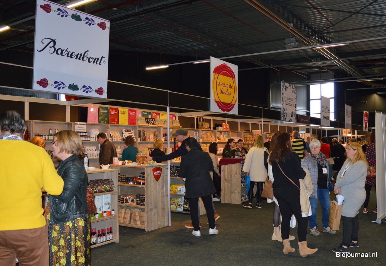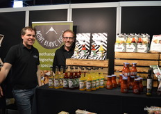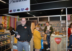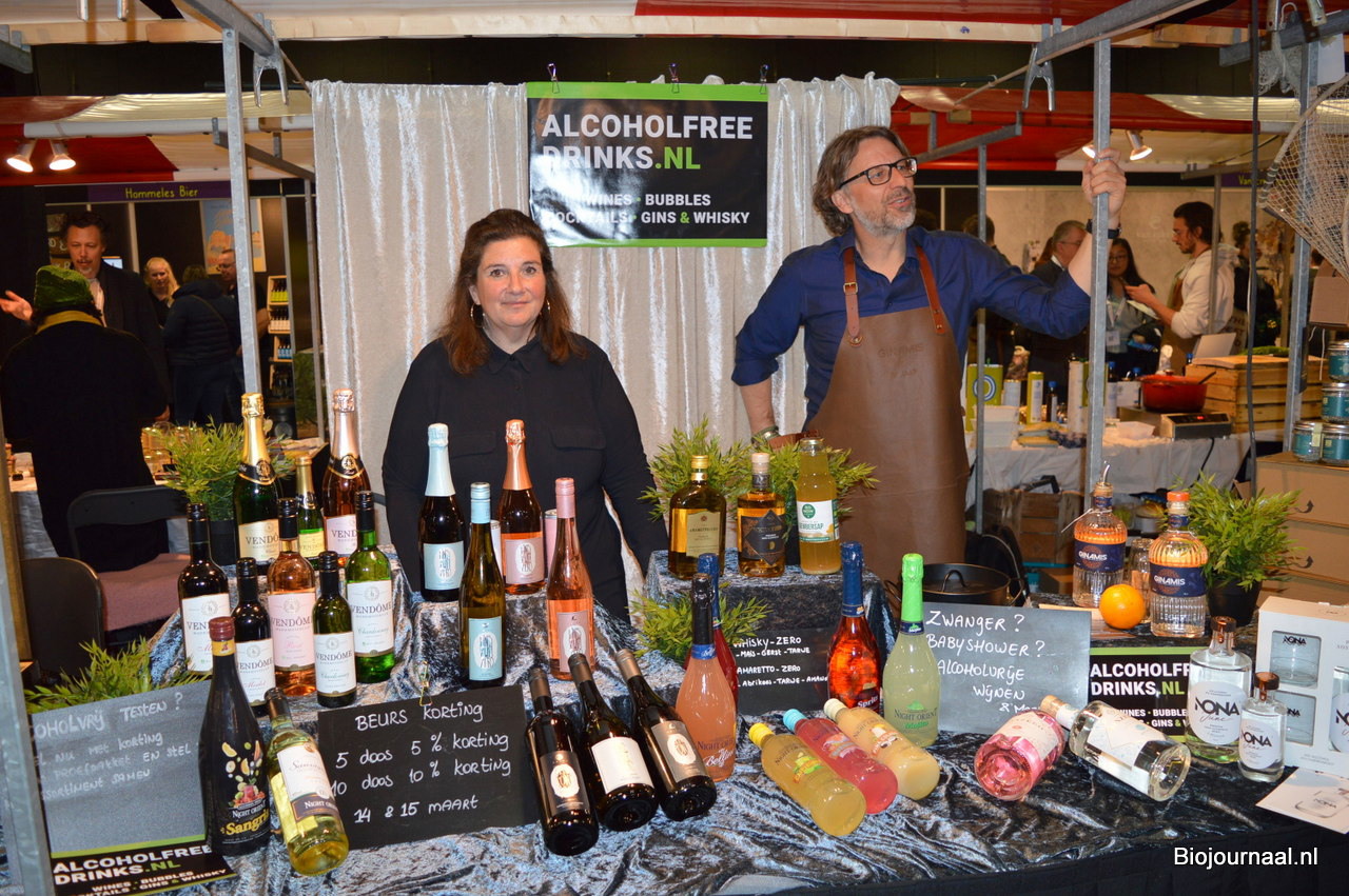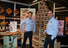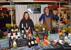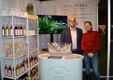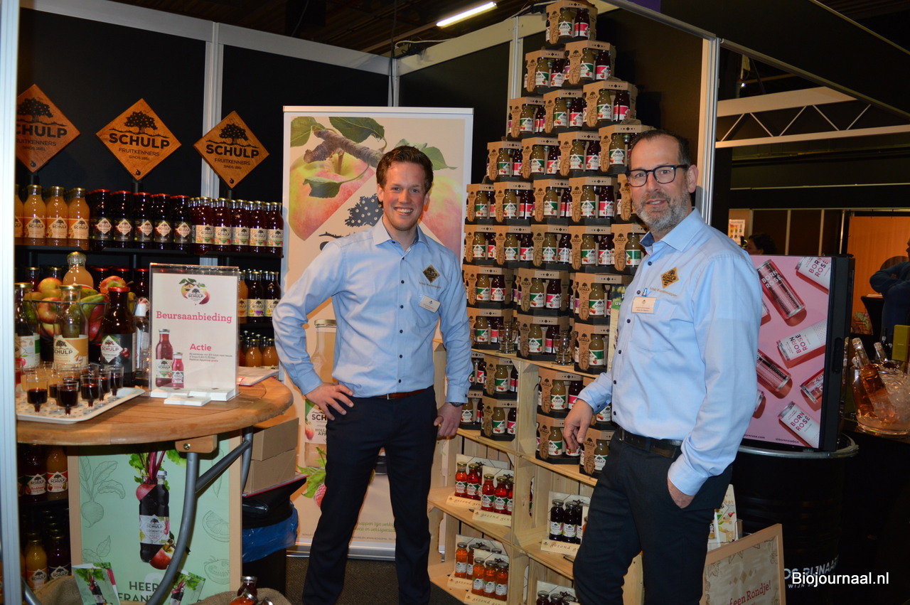 John Dorst en Jaap van Pijkeren met achter hen de (biologische) vruchtensappen van Schulp. De eerste indruk van de nieuwe beurs is goed, vertelde Jaap. "Het is klein en intiem qua opzet."