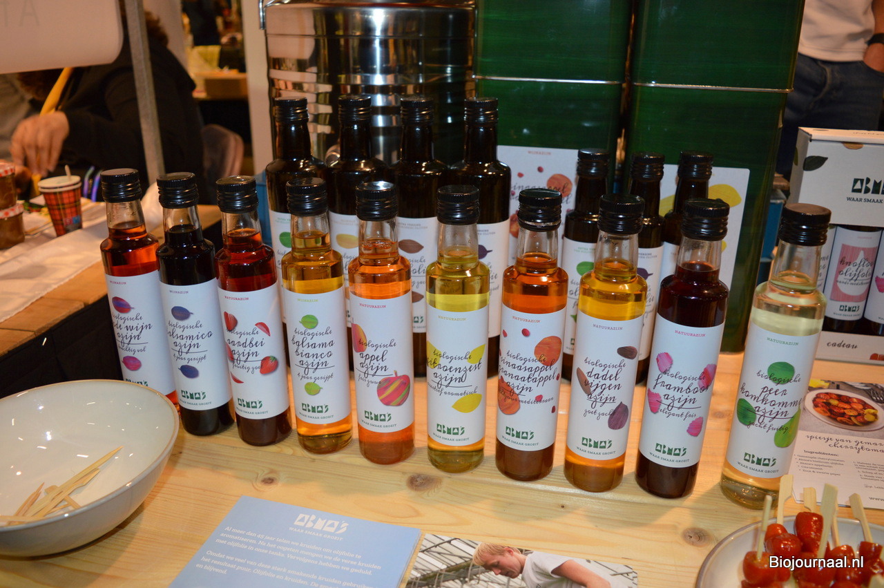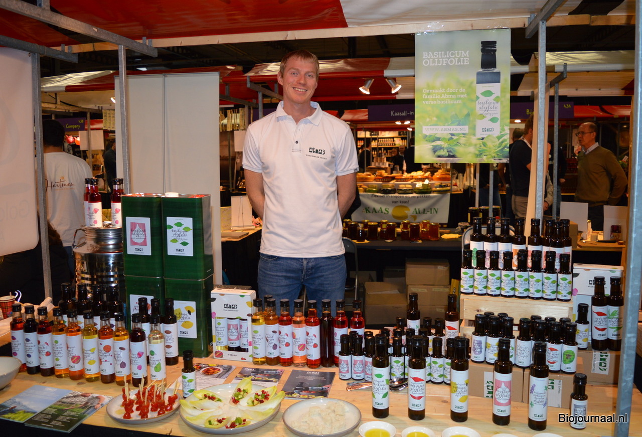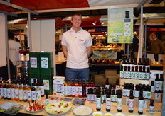 Cesar Abma in een goed gevulde kraam met allerlei varianten biologische olijfolie en azijn van Abma's. Sinds kort zijn een aantal producten verkrijgbaar bij Udea.